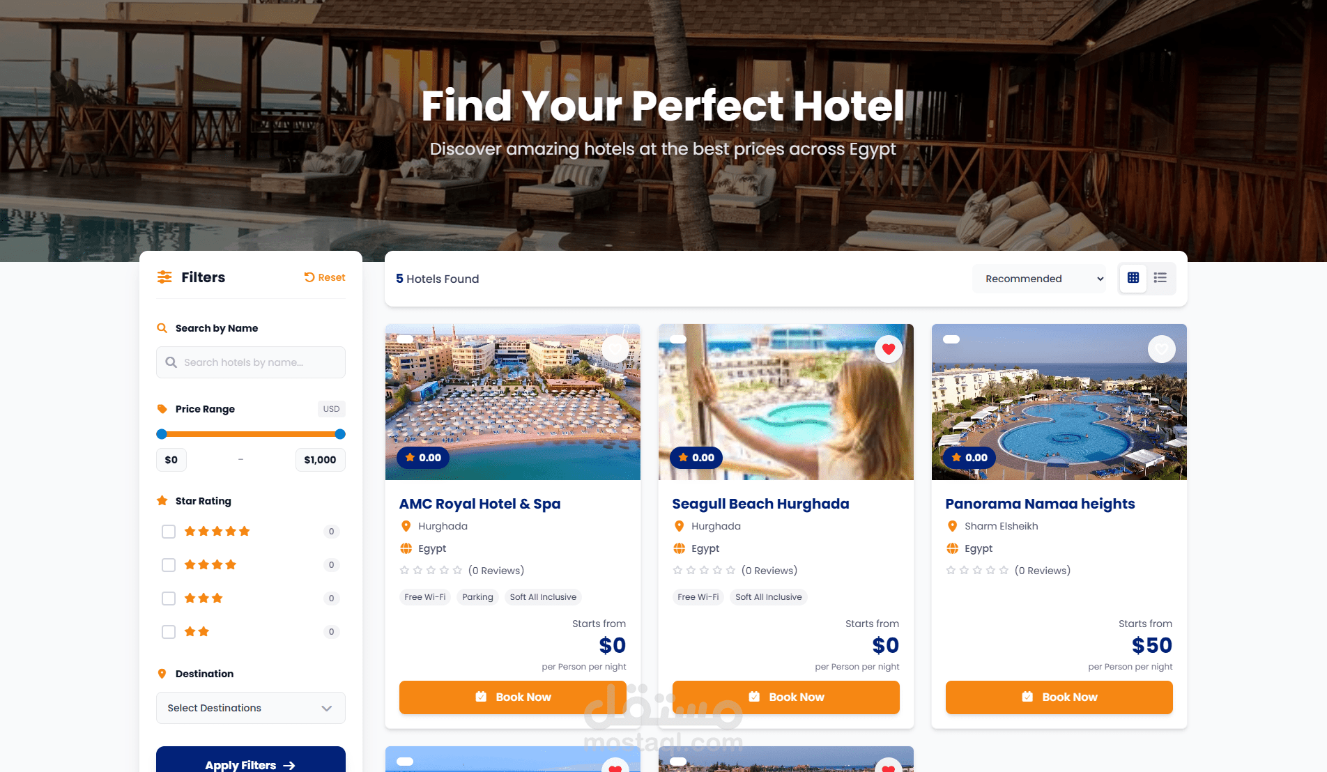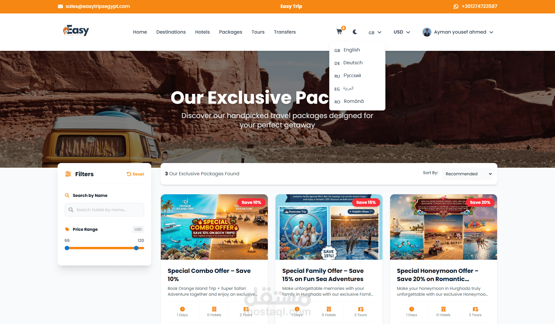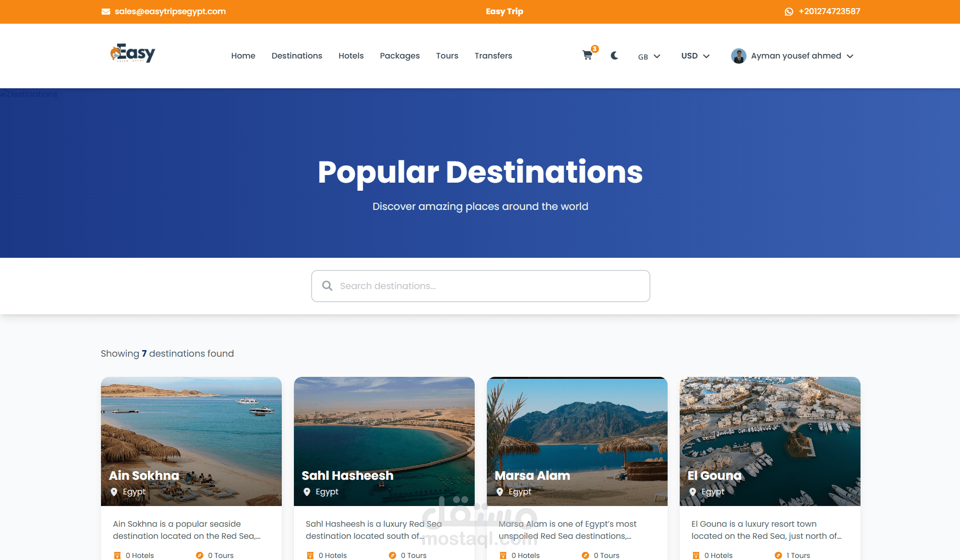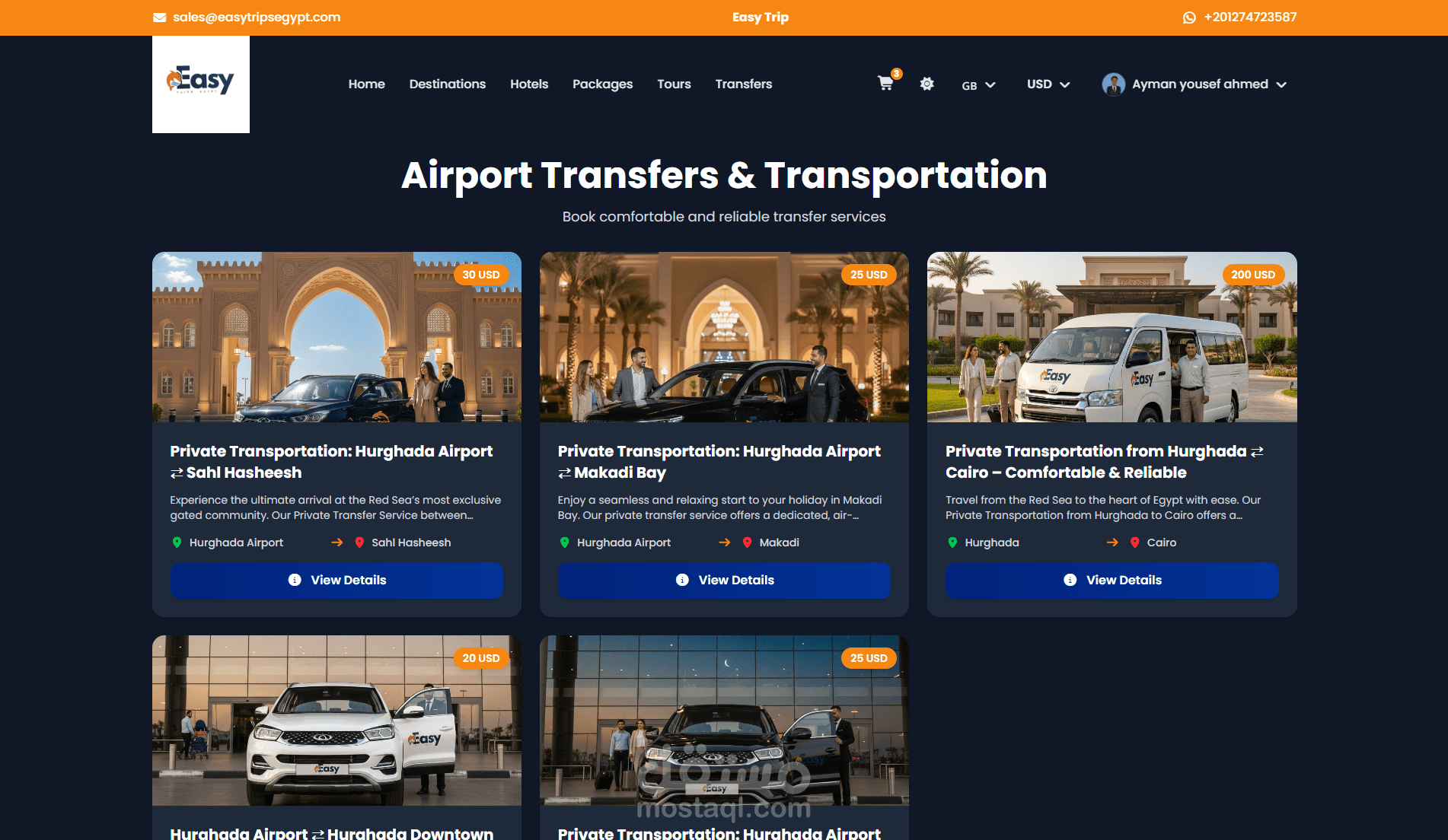 اسم المشروع: Easy Trip - منصة حجز خدمات سياحية متكاملة نظرة عامة: تطبيق ويب متطور وسريع الأداء يهدف لتسهيل تجربة السفر والسياحة (خاصة في الغردقة ومصر)، حيث يتيح للمستخدمين حجز الفنادق، الجولات السياحية، وخدمات النقل (Transfers) بكل سهولة. تم بناء المشروع باستخدام أحدث تقنيات الويب لضمان تجربة مستخدم سلسة ودعم كامل لمحركات البحث (SEO).