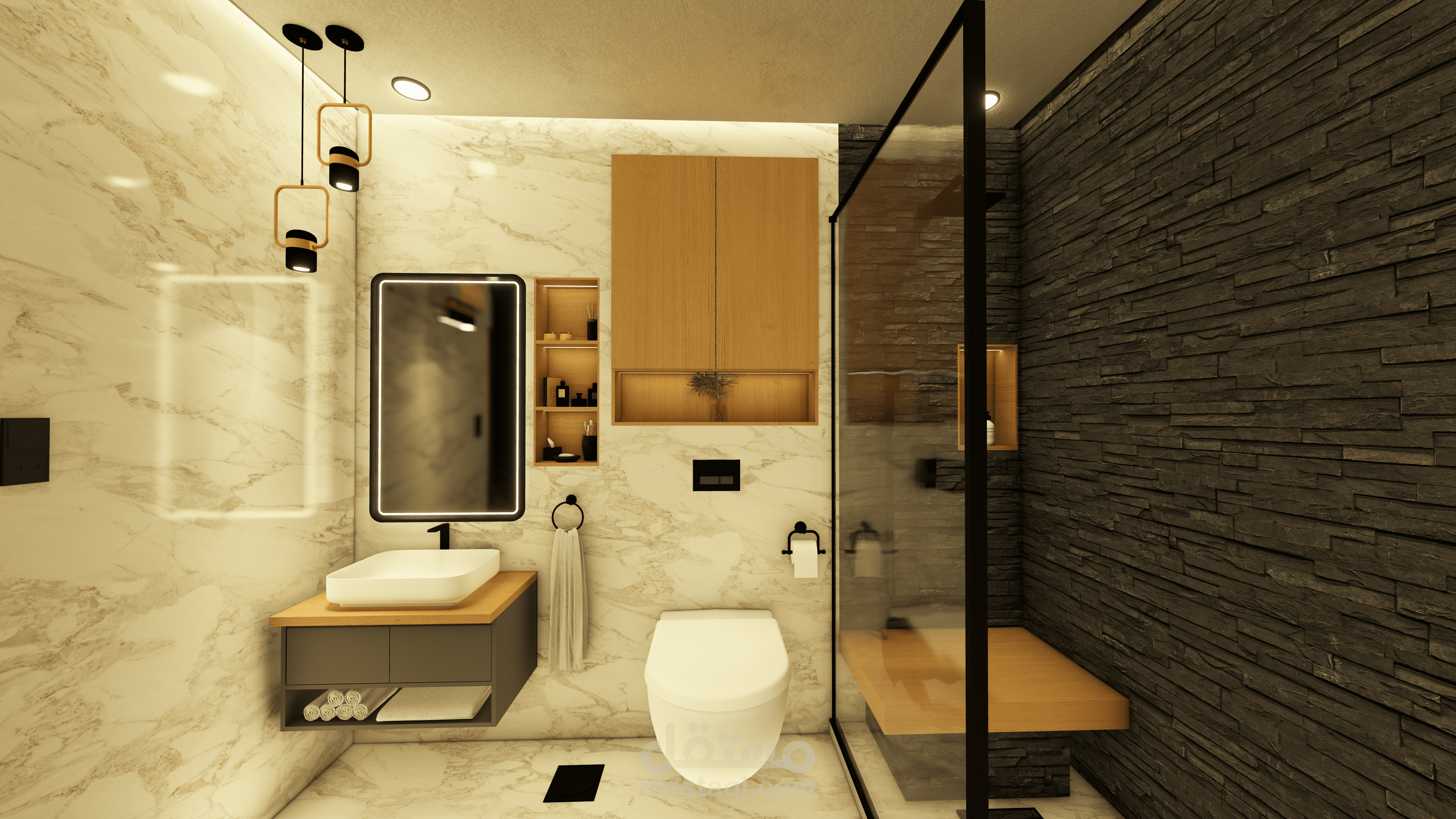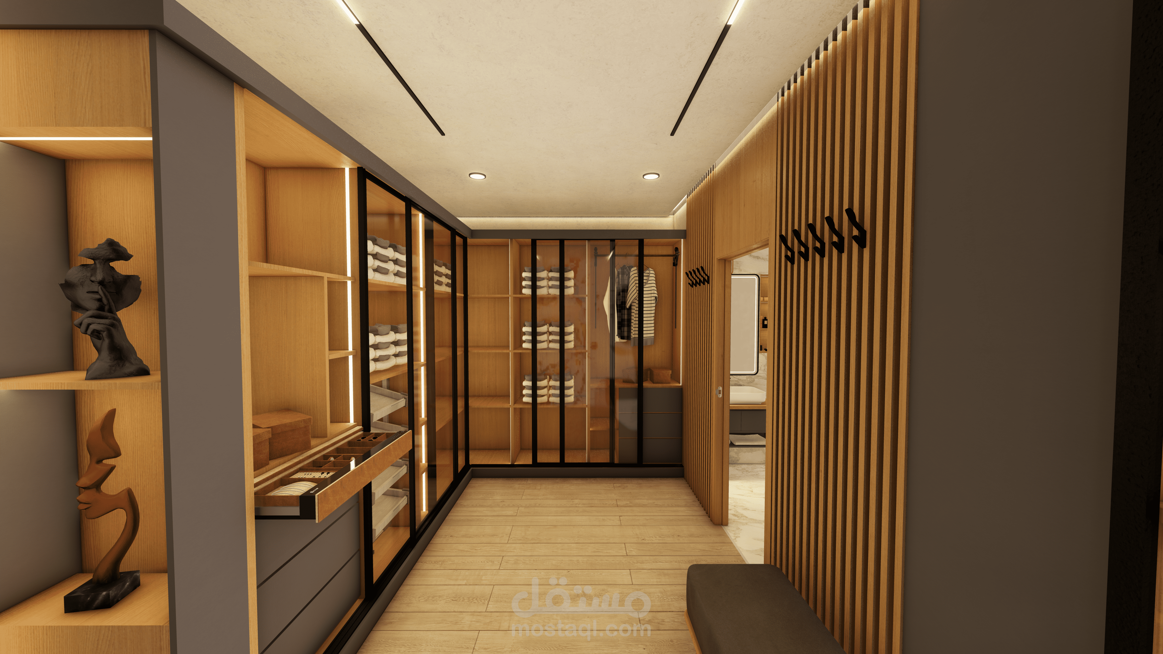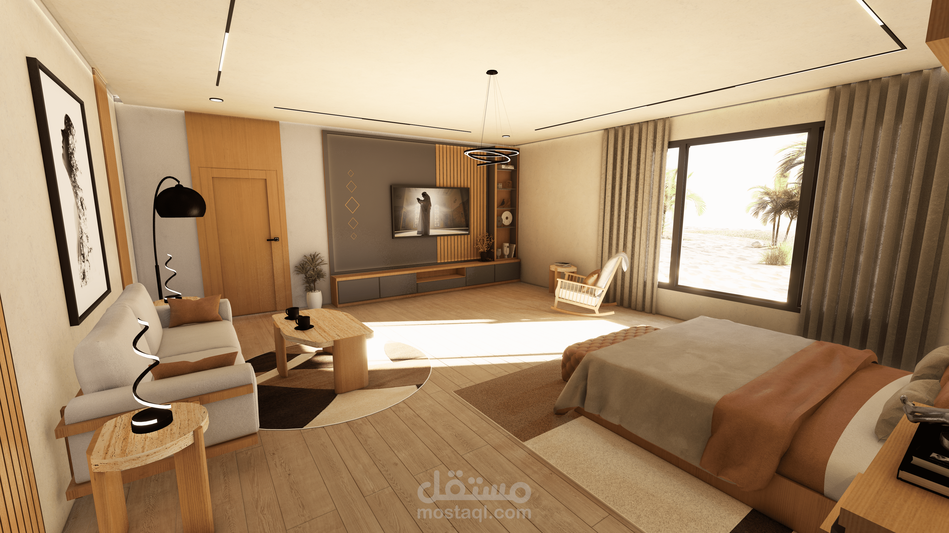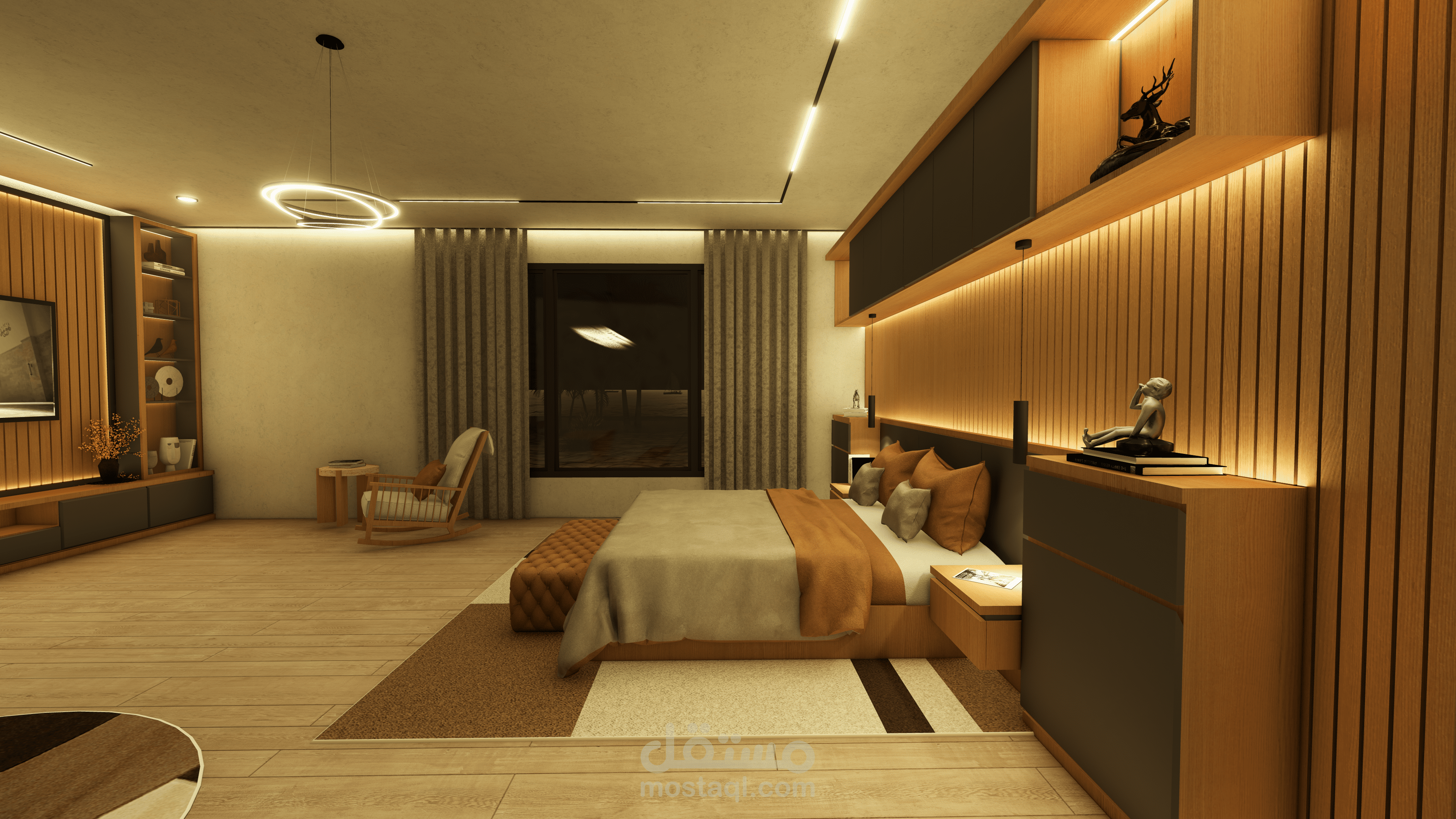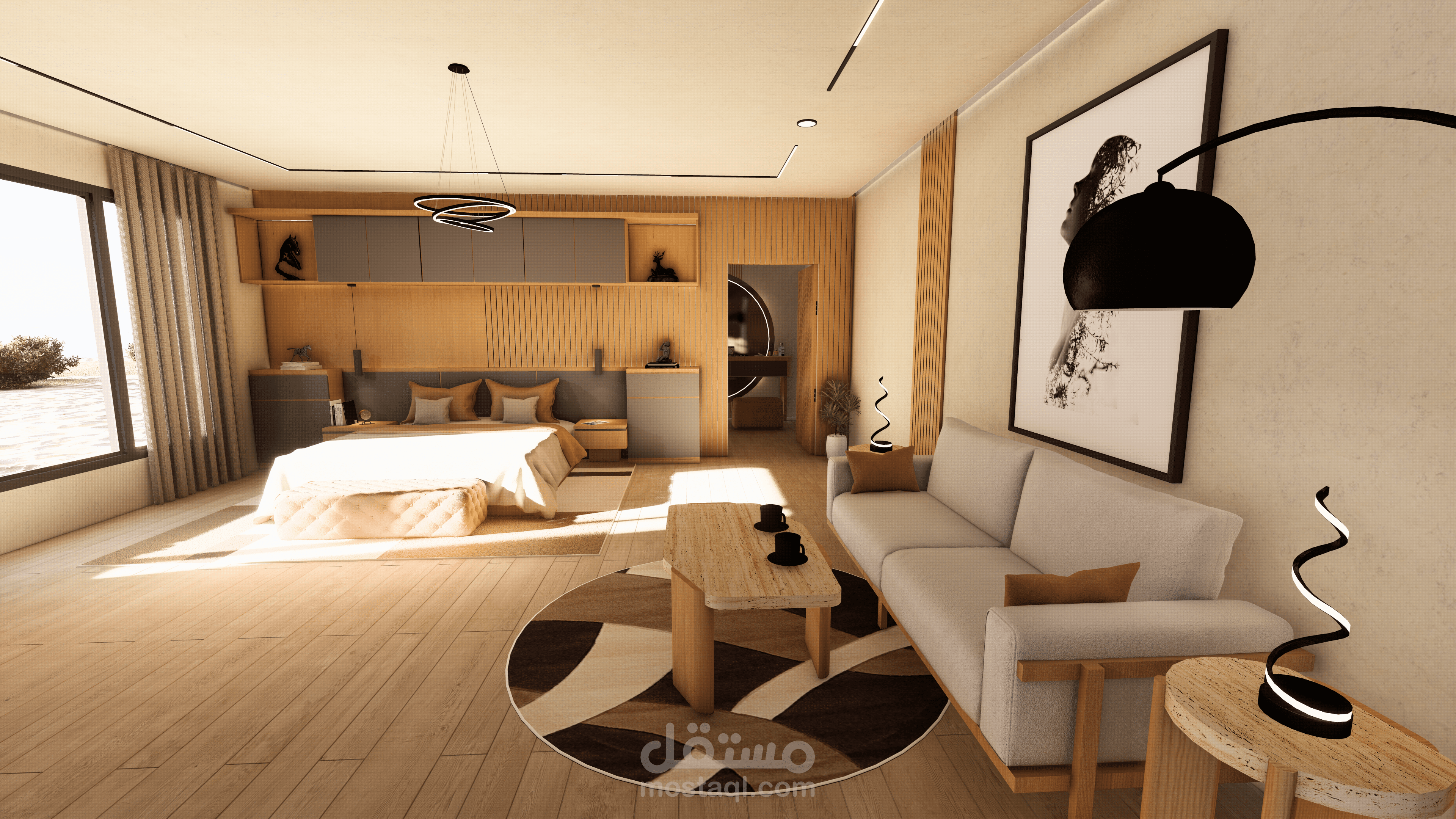 غرفة نوم ماستر مع دريسنج فاخر، تجمع بين الراحة، الأناقة، والتخزين العملي. تصميم عصري مع إضاءة مدروسة ومساحات منظمة لتجربة نوم ودريسنج مثالية.