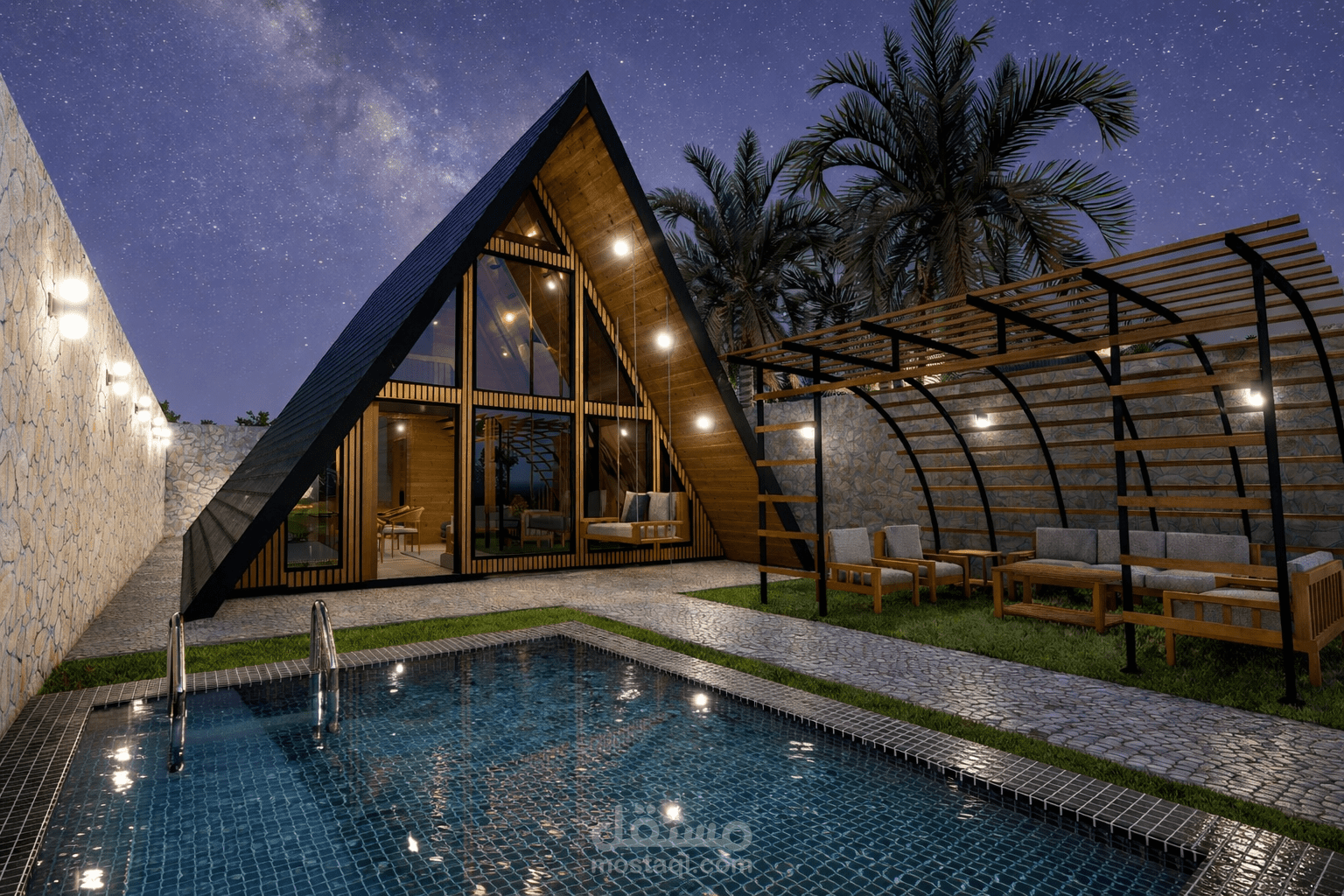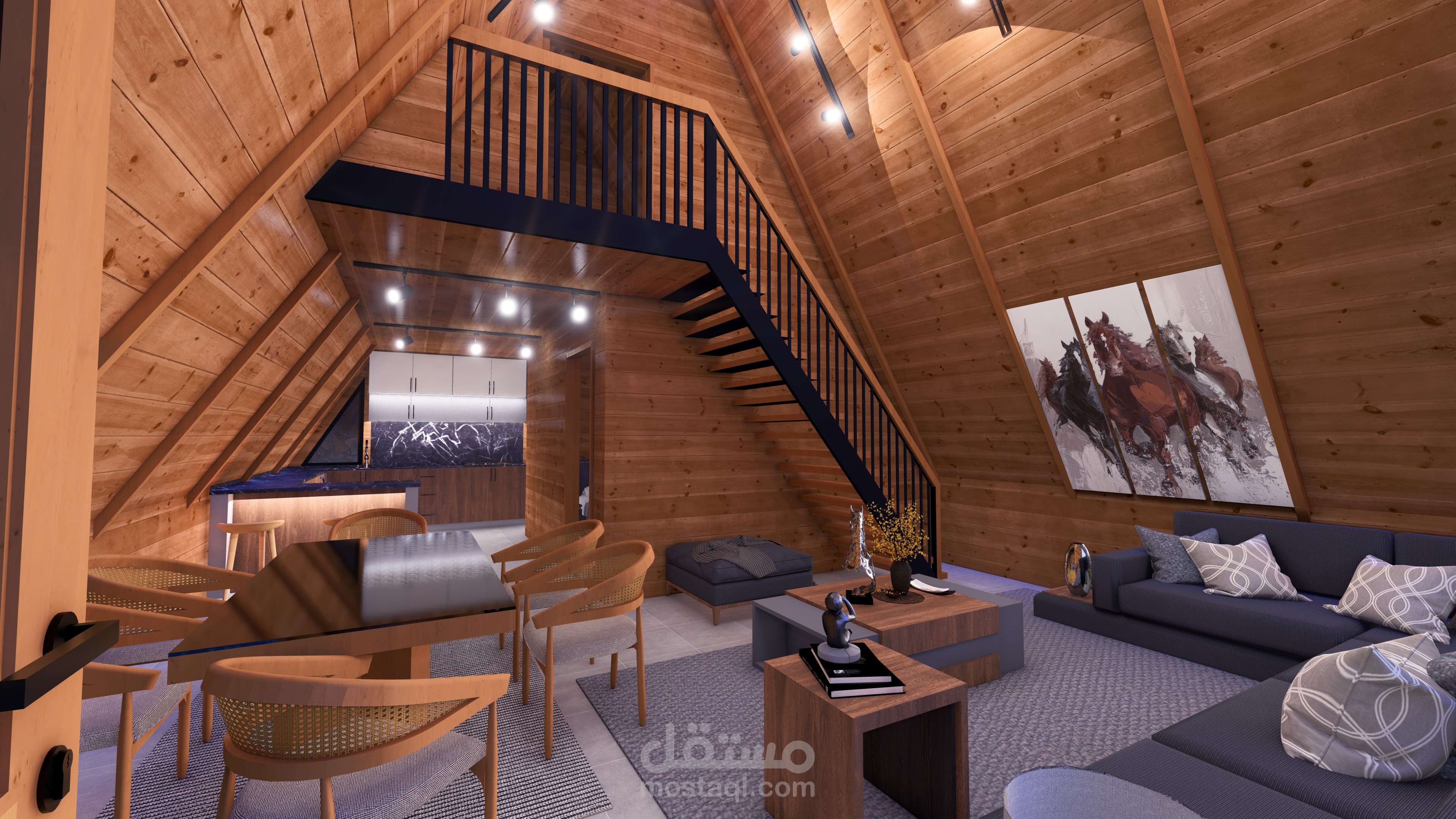كوخ خشبي دورين بتصميم A-Frame المثلث، يتميز بواجهة زجاجية وارتفاع داخلي مزدوج يمنح إحساسًا بالاتساع والدفء، في تجربة سكنية عصرية منسجمة مع الطبيعة.