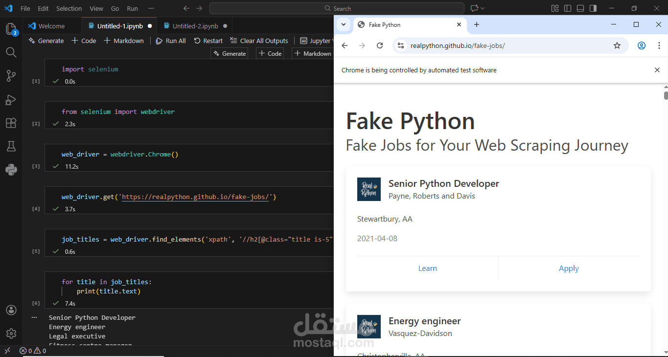 A web scraping project built using Python and Selenium to automatically extract job listing data from a dynamic website. The project demonstrates how to interact with web pages, locate HTML elements, and collect structed data for analysis.
