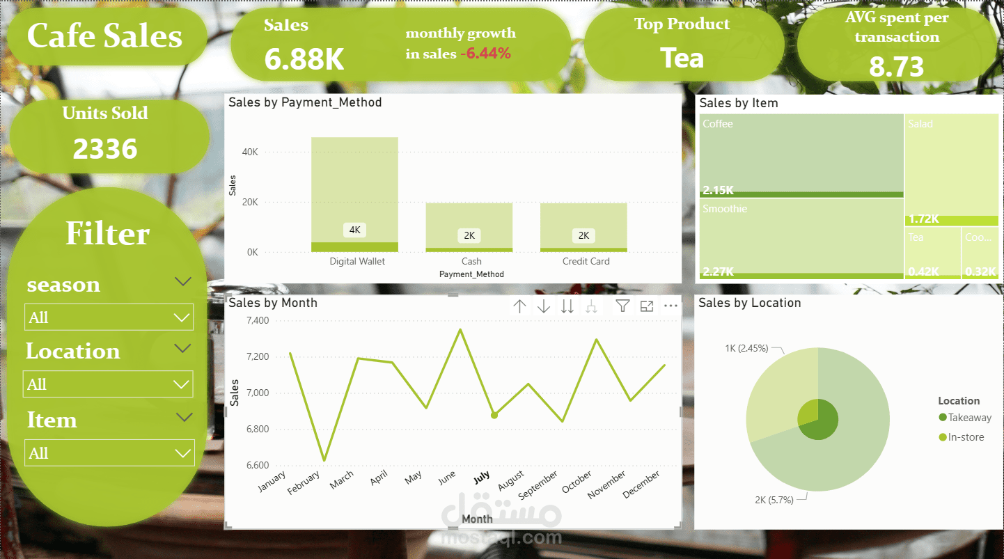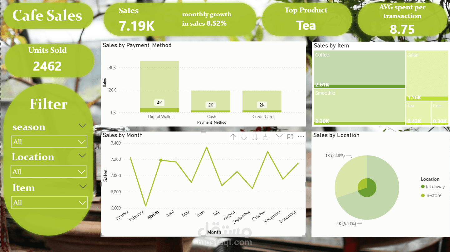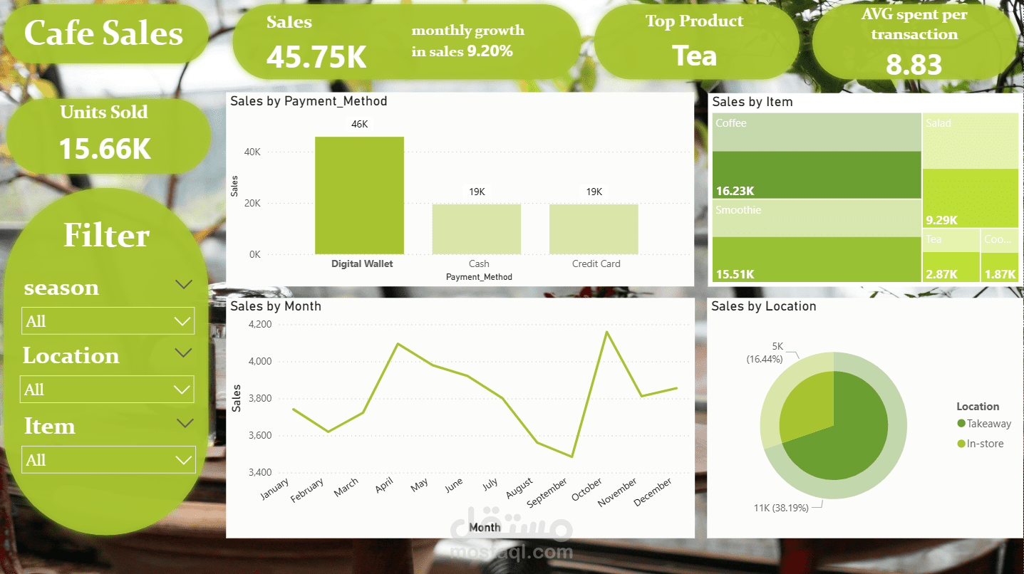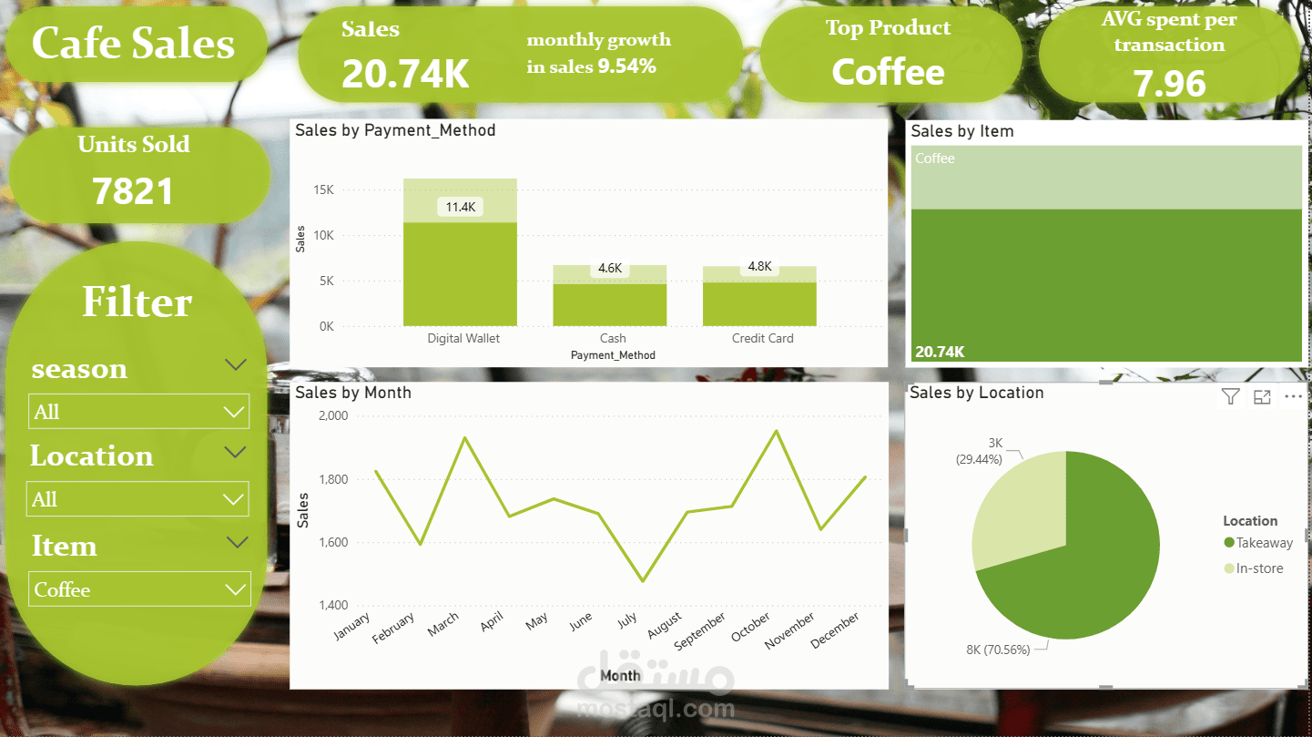 الداش بورد دي بتقدم نظرة شاملة وتحليلية لأداء مبيعات الكافيه، وصممتها مخصوص عشان تدعم اتخاذ قرارات البيزنس بناءً على أرقام حقيقية. اللوحة بتجمع بيانات العمليات اليومية وبتحولها لرؤى واضحة (Insights) بتساعد أصحاب المصلحة يفهموا اتجاهات الأرباح، سلوك العملاء، والأداء التشغيلي من حيث الوقت، المنتجات، الفروع، وطرق الدفع.