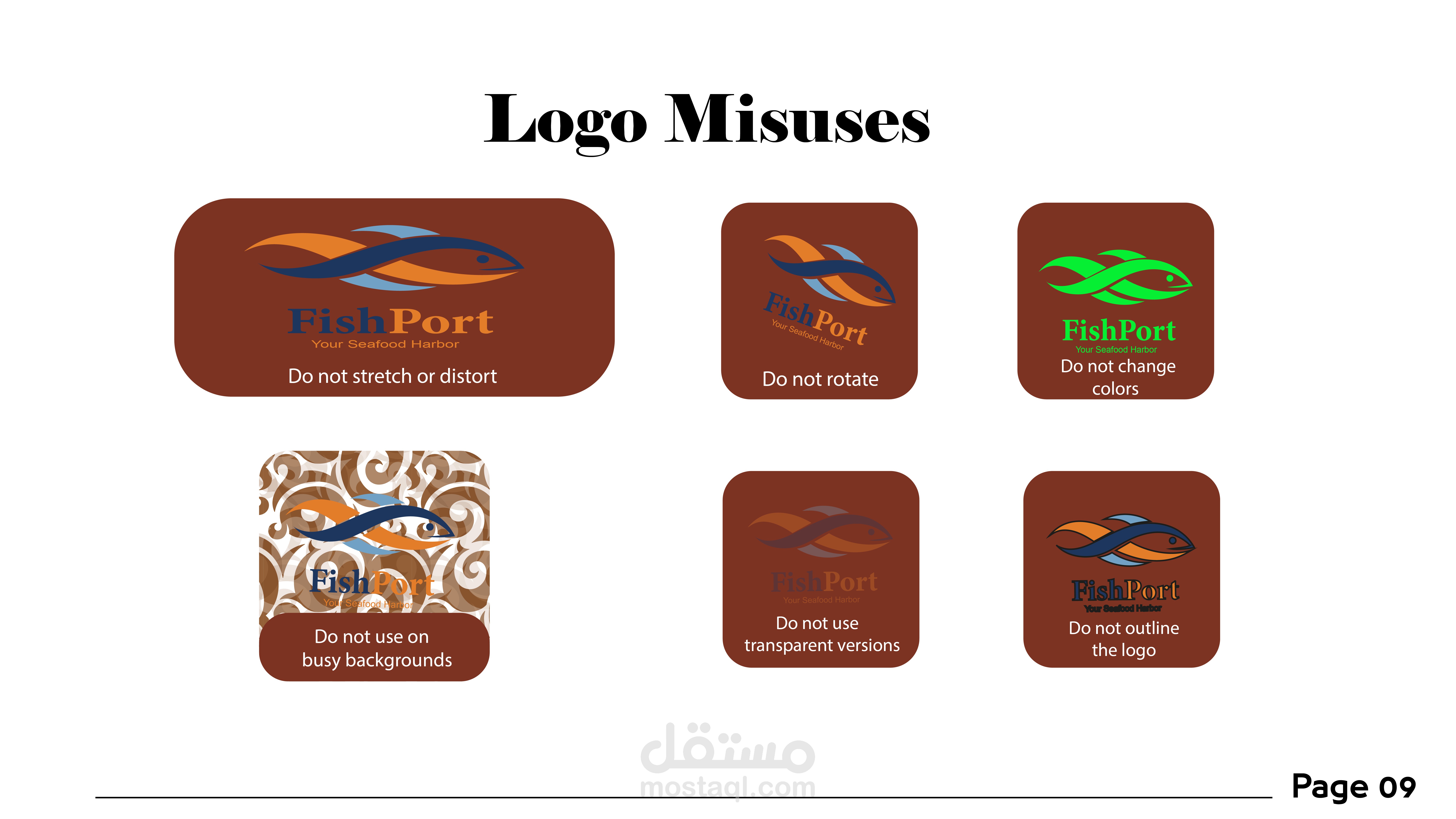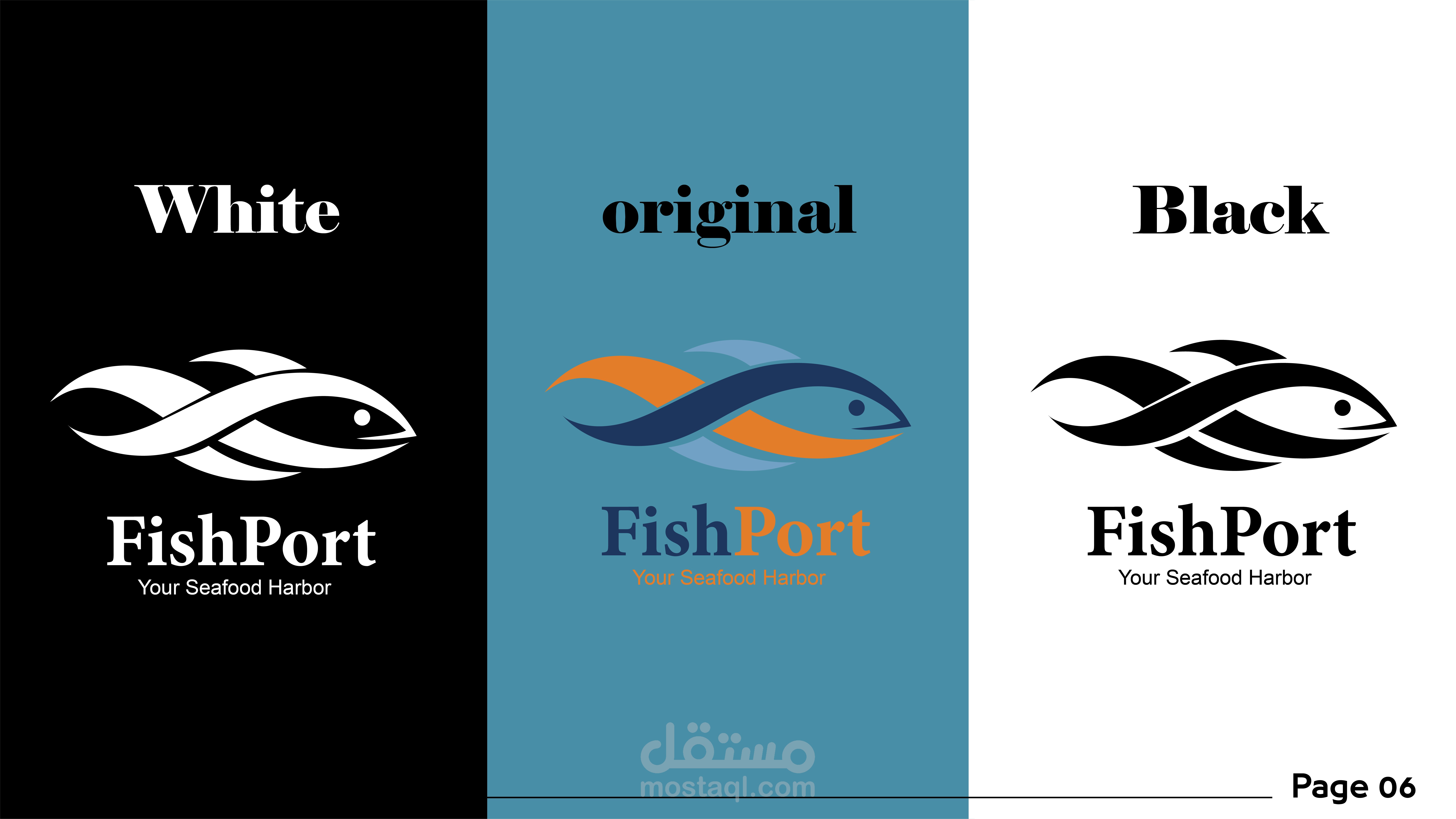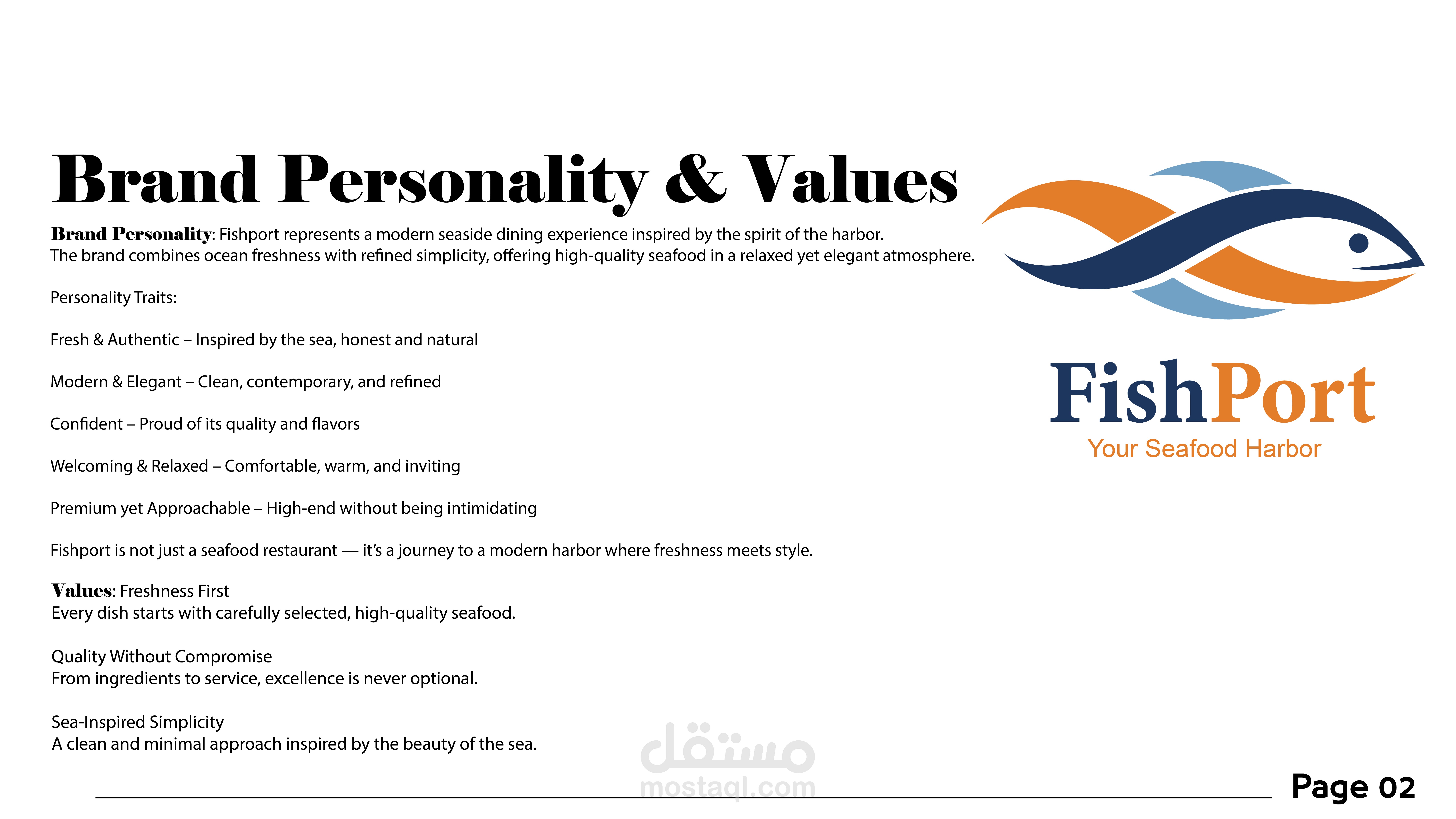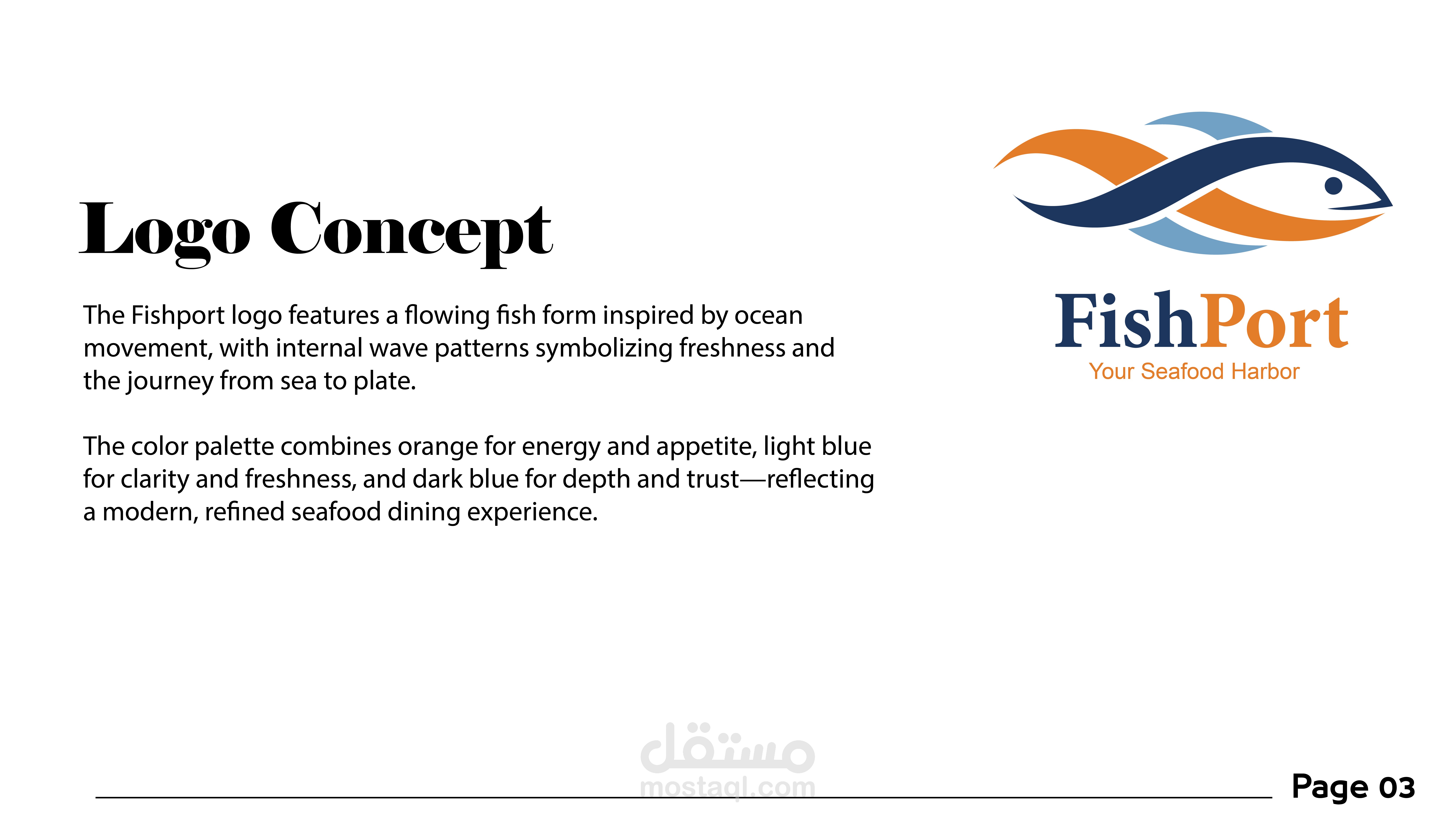 Fish Port is a modern seafood restaurant inspired by the spirit of the sea and coastal ports, where freshness meets simplicity and contemporary design. The logo was designed to reflect the essence of the brand through a dynamic fish shape, combined with a color palette drawn from marine elements—deep blue and aqua tones representing the sea, balanced with vibrant orange accents symbolizing energy and fresh food. The visual identity focuses on clarity, trust, and quality, while maintaining a modern and approachable character suitable for a contemporary seafood dining experience. The design system is flexible and scalable, allowing the brand to remain strong and recognizable across