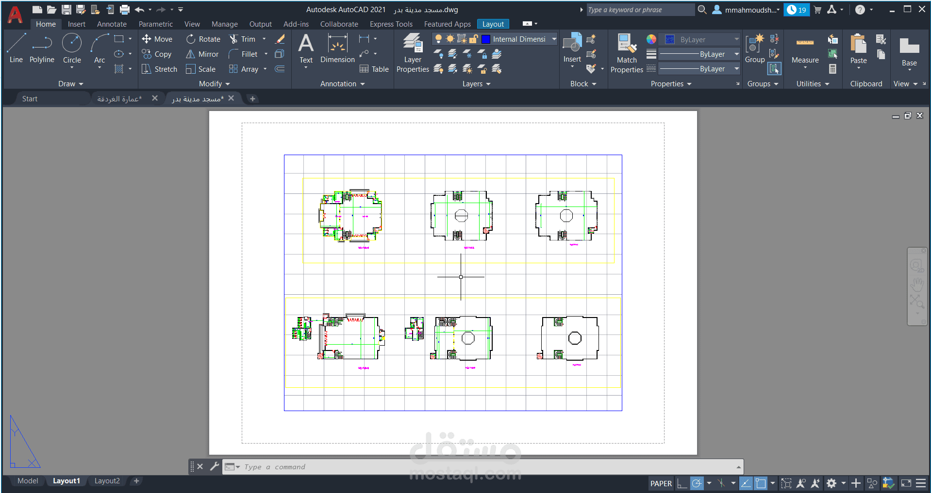 تم تنفيذ هذا العمل باستخدام AutoCAD 2021، وهو عبارة عن مجموعة رسومات معمارية متكاملة لمسجد، تشمل مخططات متعددة توضح توزيع الفراغات المعمارية والعناصر الخدمية بدقة ووضوح.