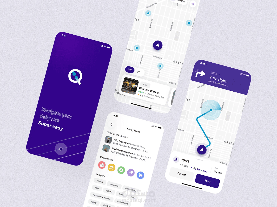 شاشات تطبيق توصيل ، جامعًا بين تصميم أنيق ووظائف سهلة الاستخدام. صُمم هذا التطبيق بألوان مستقبلية تجمع بين البنفسجي والأزرق، ليجعل التنقل اليومي أكثر ذكاءً وسرعةً وراحةً.