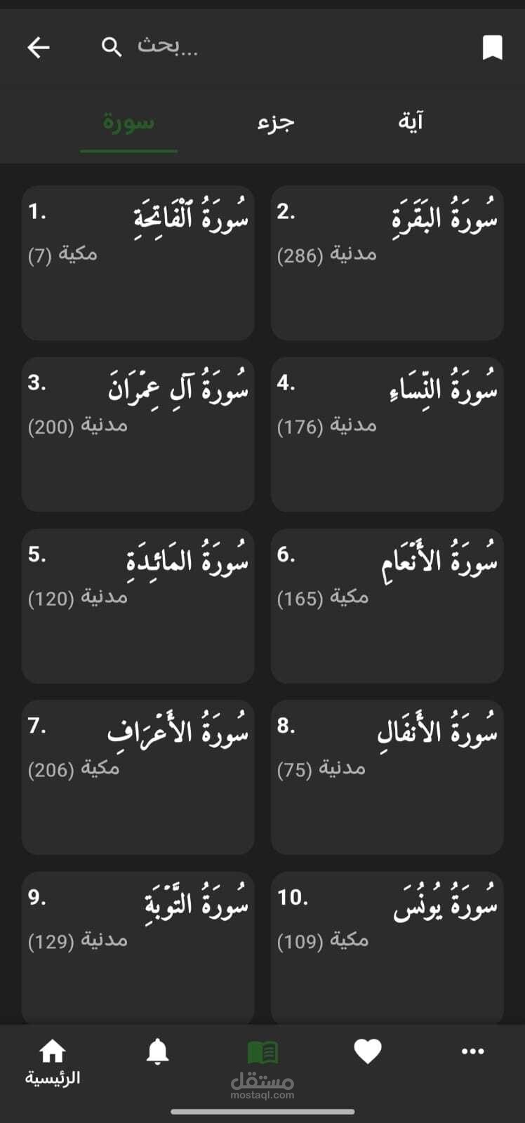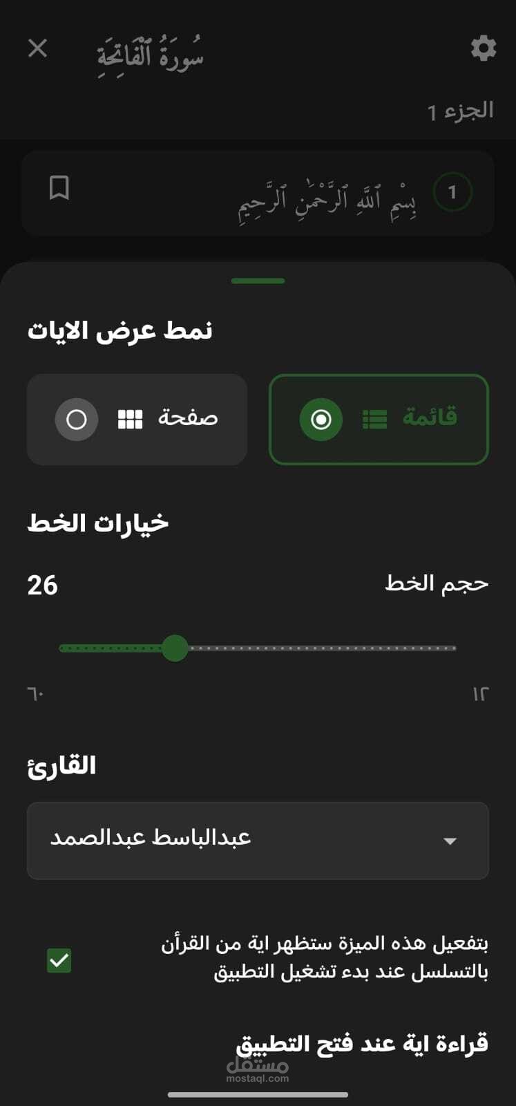 دمج القرآن: نص كامل للقرآن مع التفسير، إمكانية وضع العلامات (Bookmarking)، وتشغيل التلاوة الصوتية من عدة قراء.