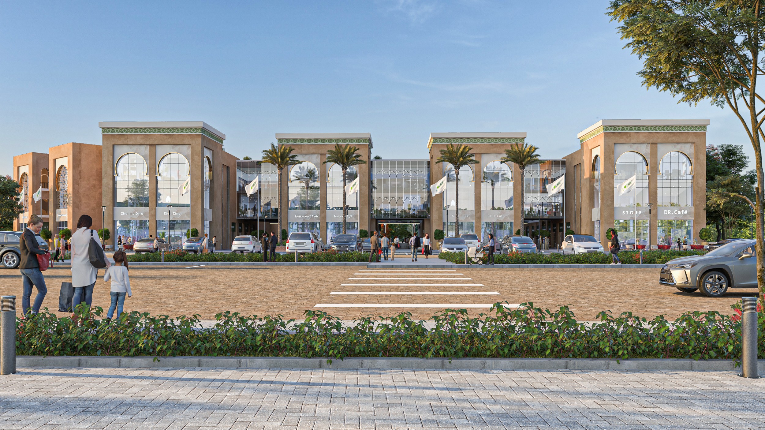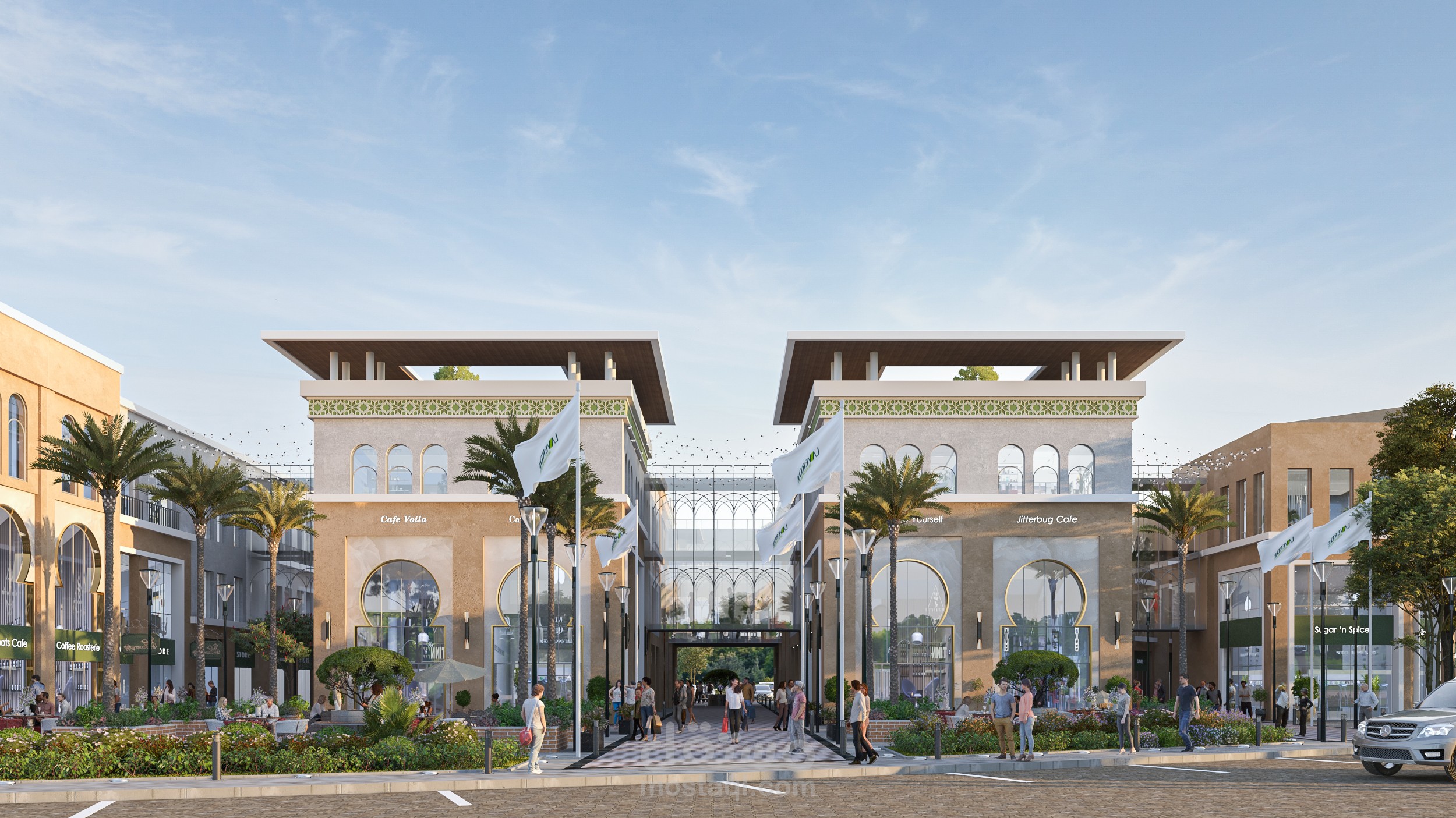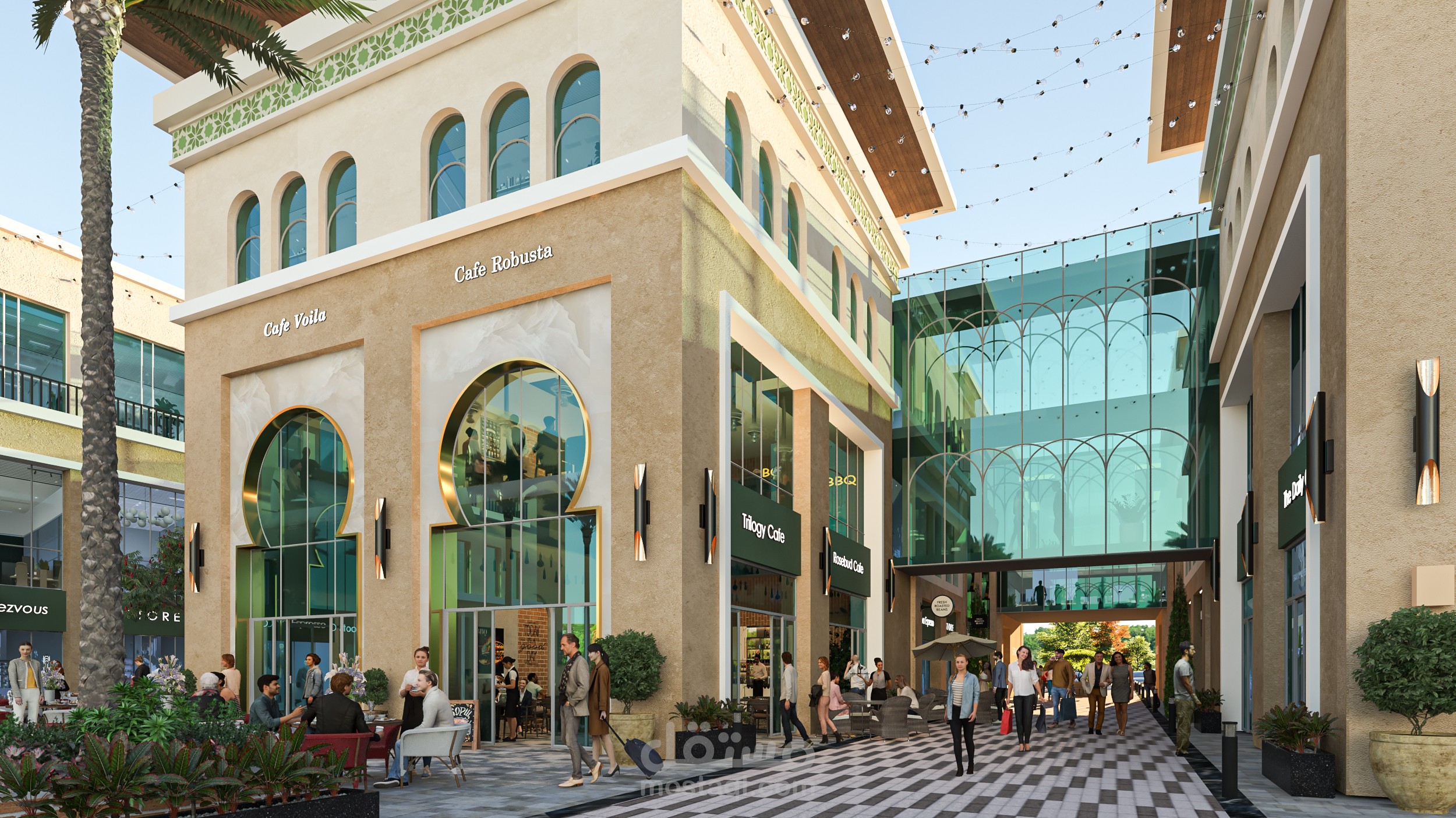 Architectural Fusion: The buildings feature a sophisticated mix of sand-toned textured finishes and ornate gold-filigree horseshoe arches, a clear nod to Islamic architectural heritage.