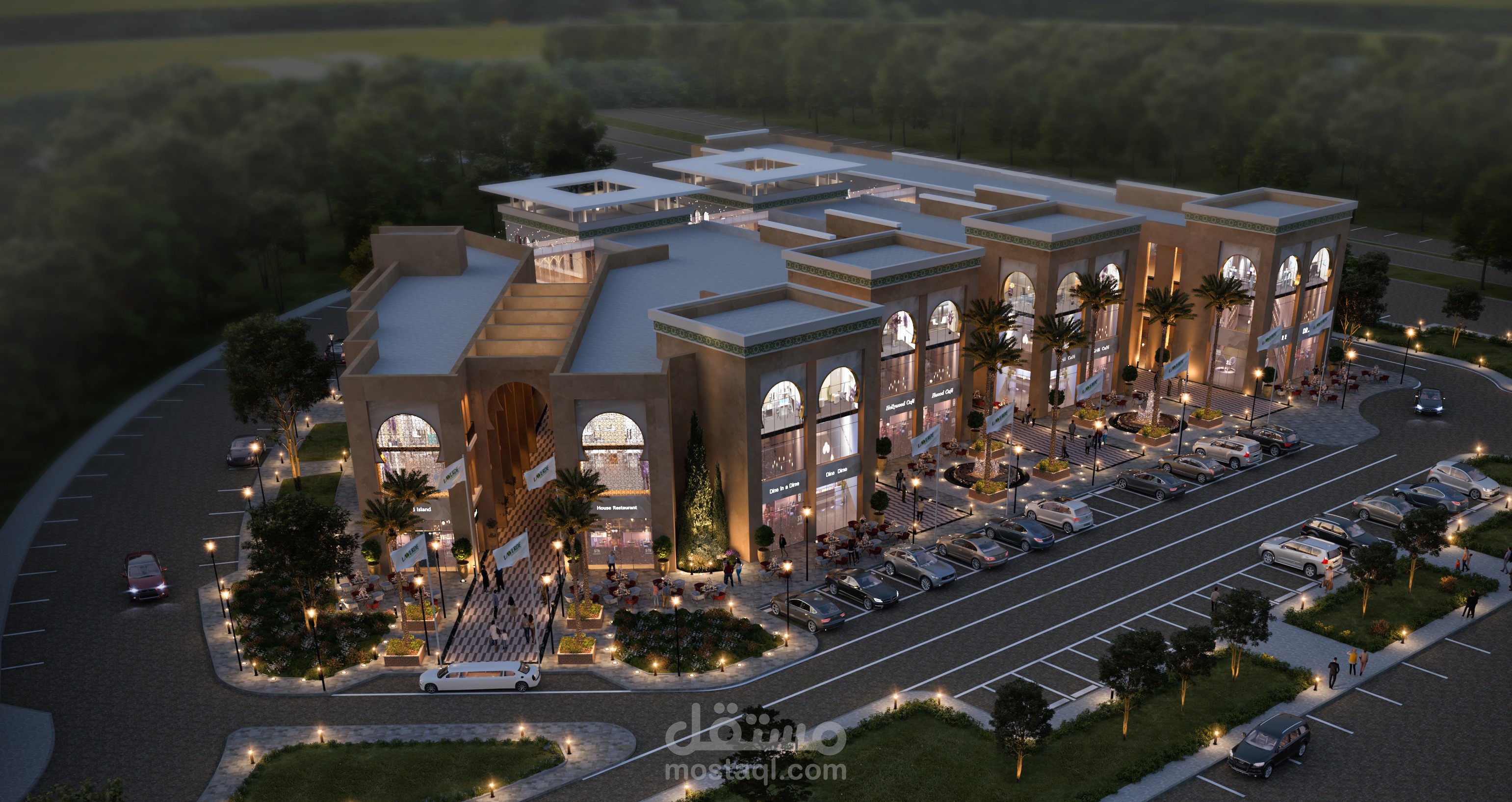 This series of high-fidelity 3D renderings depicts an upscale outdoor shopping and dining district. The design focuses on a "lifestyle center" concept, combining traditional cultural motifs with modern luxury retail architecture.