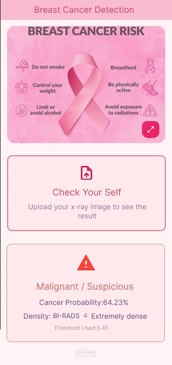 Developed a Flutter mobile app that uploads mammogram images to an AI server and displays real-time predictions for cancer severity and breast density (BI-RADS) using a deep-learning backend.