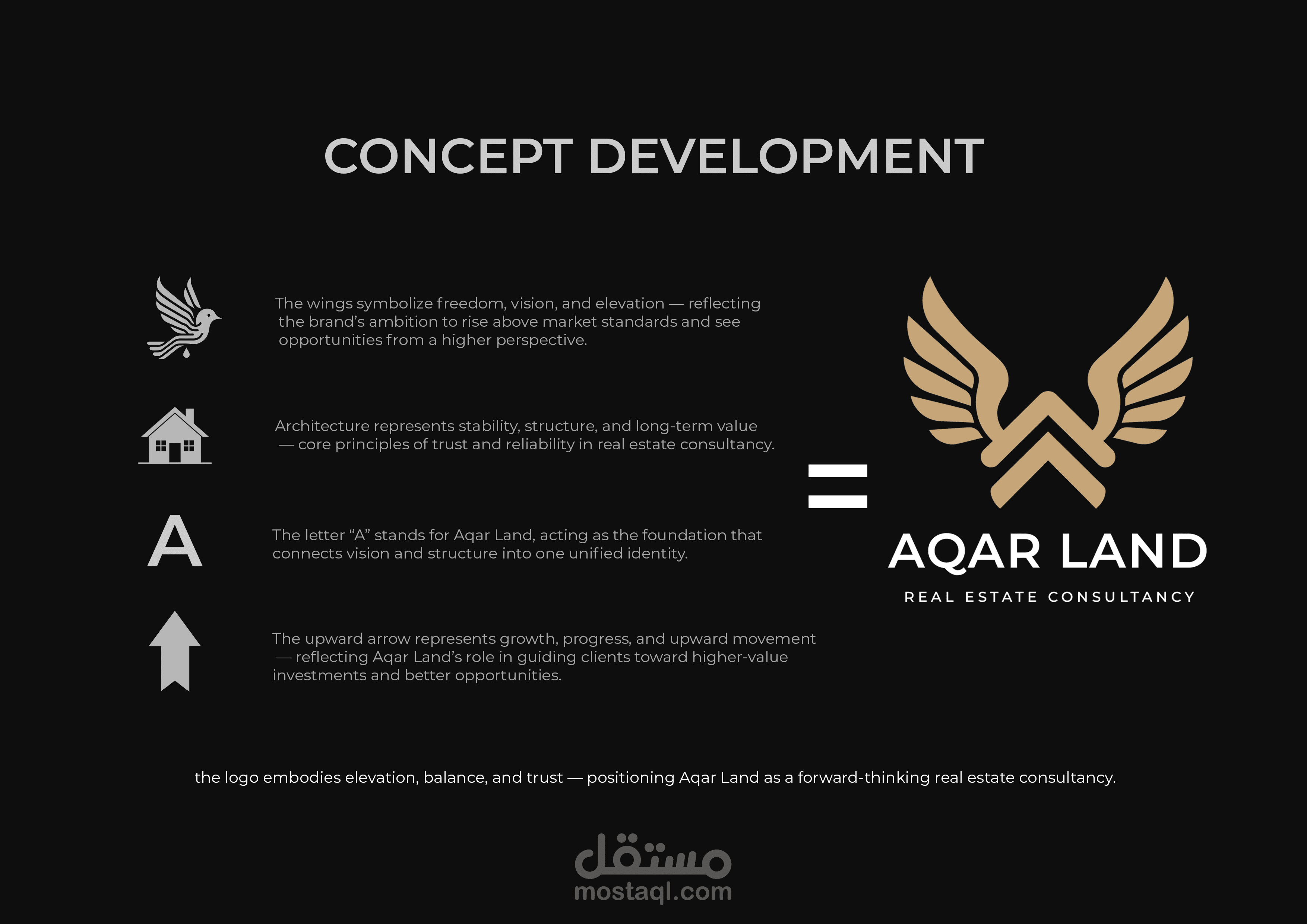 تم تنفيذ الشعار بأسلوب Minimal & Premium Branding من خلال رمز هندسي متوازن مستوحى من الأجنحة، يرمز إلى الارتقاء، الحماية، والرؤية المستقبلية، مع دمج ذكي لحرف العلامة داخل الرمز ليعزز الهوية البصرية ويجعل الشعار سهل التذكر.