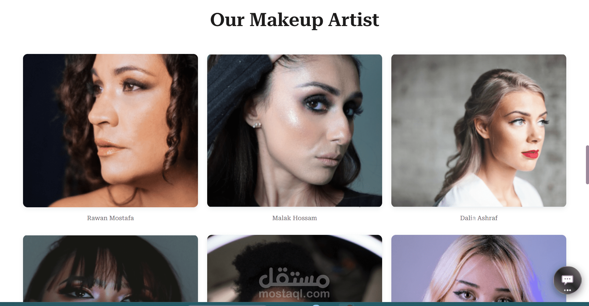 يسلط هذا القسم الضوء على فنانات المكياج المحترفات في الفريق، مع عرض صور لعملهن مع تسميات لهن مثل "Rawan Mostafa"، "Malak Hossam"، و "Dalia Ashraf".