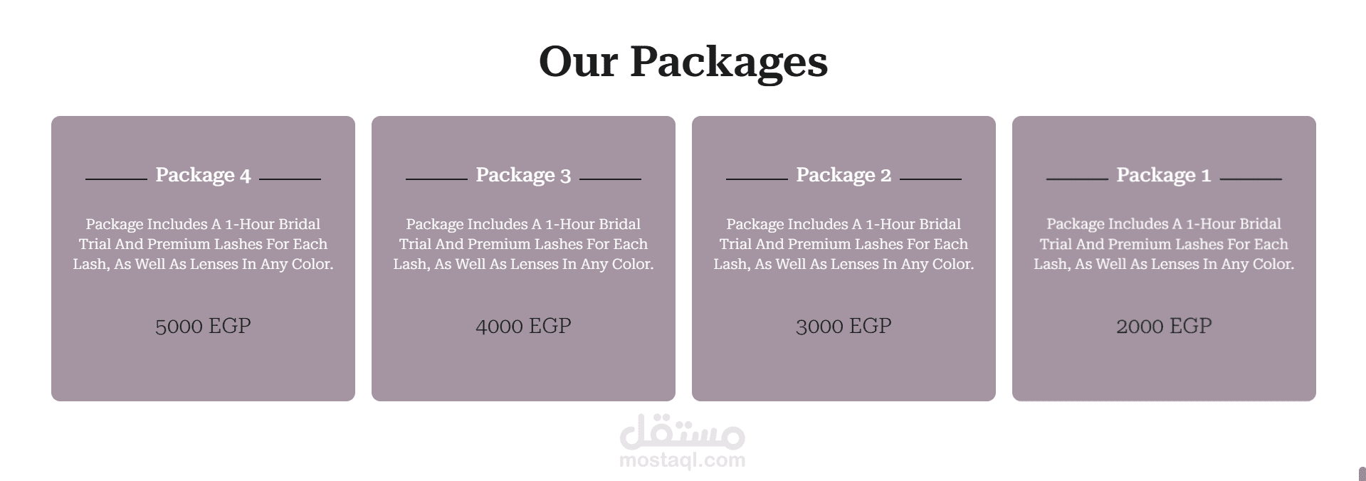 الباقة 2 و3 و4: تختلف الأسعار والخدمات حسب نوع الباقة، مع التفاصيل التي تشمل العناية بالبشرة والتجهيزات المختلفة.