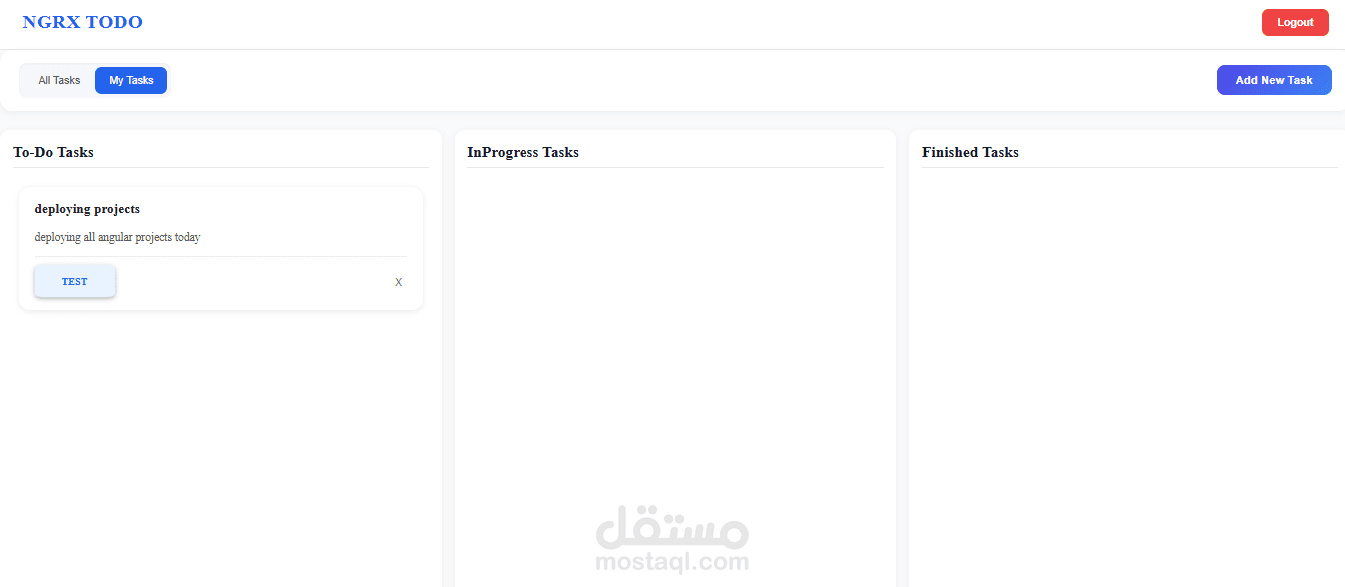 Drag-Drop Todo App تطبيق بسيط لاضافة المهام اليومية وتعديلها او حذفها باستخدام NGRX مع امكانية سحب المهمة ونقلها من فئة لاخرى واضافة تعليقات على المهمات بالاضافة الى انشاء حساب و تسجيل الدخول