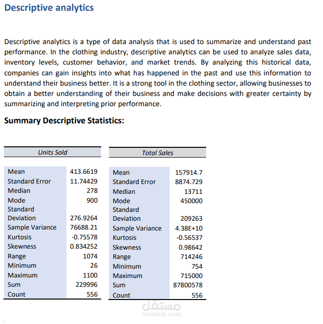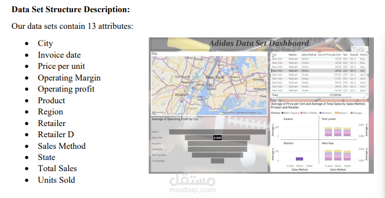هذا العمل هو عبارة عن مشروع جامعي في مجال "ذكاء الأعمال" (Business Intelligence) تم تطبيقه على قطاع تجارة الملابس بالتجزئة، مع اتخاذ شركة "أديداس" (Adidas) كحالة دراسية. يتميز المشروع بقدرته على تحويل البيانات الضخمة والخام إلى رؤى قيمة تدعم اتخاذ قرارات استراتيجية تتعلق بالتسعير، وإدارة المخزون، وفهم سلوك المستهلكين. أما عن طريقة التنفيذ، فقد اتبع فريق العمل منهجية منظمة بدأت بتحديد مصادر البيانات واستخراجها، ثم تنظيفها وتحويلها (ETL)، وصولاً إلى تخزينها في مستودع بيانات ذو بنية ثلاثية الطبقات (3-tier architecture) لضمان المرونة والكفاءة. وفي المرحلة النهائية، استُخدمت أدوات التحليل الوصفي (Descriptive analytics) والتقنيات المرئية مثل لوحات البيانات (Dashboards) والتحليل التنبؤي عبر الانحدار الخطي (Linear Regression) لعرض النتائج وتحليل الأداء الفعلي مقابل الأهداف المخطط لها.