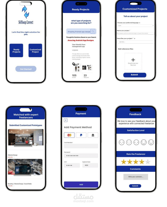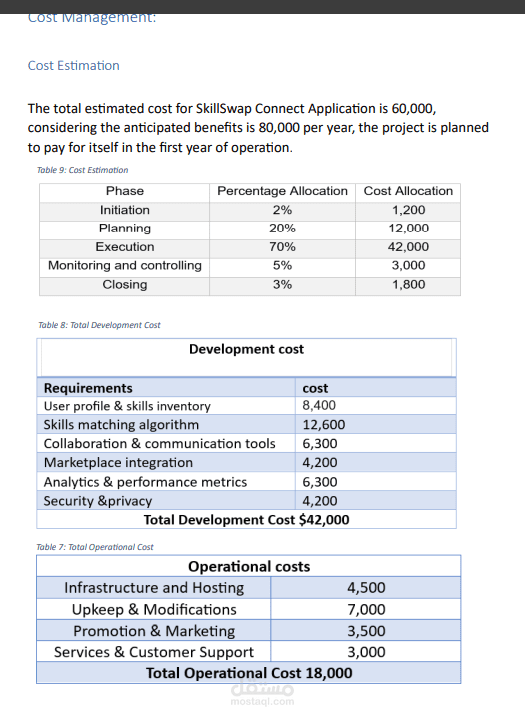 يُعد هذا العمل مشروعاً تقنياً لإدارة المشاريع (IT Project Management) يهدف إلى تطوير تطبيق محمول يُدعى "SkillSwap Connect" ، وهو منصة مبتكرة صُممت لربط الأفراد، الطلاب، والمستقلين لتبادل المهارات التكميلية وتعزيز الابتكار التعاوني. يتميز العمل بكونه نظاماً بيئياً متكاملاً لا يقتصر فقط على التشبيك، بل يضم سوقاً (Marketplace) يتيح للمستخدمين عرض وبيع منتجاتهم المشتركة عالمياً ، مع ميزة فريدة تسمح للعملاء بطلب مواصفات مخصصة للمشاريع. أما عن طريقة التنفيذ، فقد اتبع المشروع منهجية إدارية دقيقة شملت مراحل البدء، التخطيط، والتنفيذ؛ حيث تم استخدام خوارزميات لمطابقة المهارات ، وتكامل مع قواعد بيانات سحابية (AWS DynamoDB) ، مع الالتزام بمعايير صارمة للأمن والخصوصية ، كما تم ضبط الجوانب المالية والجدول الزمني لضمان استرداد تكاليف المشروع البالغة 60,000 دولار خلال السنة الأولى من التشغيل