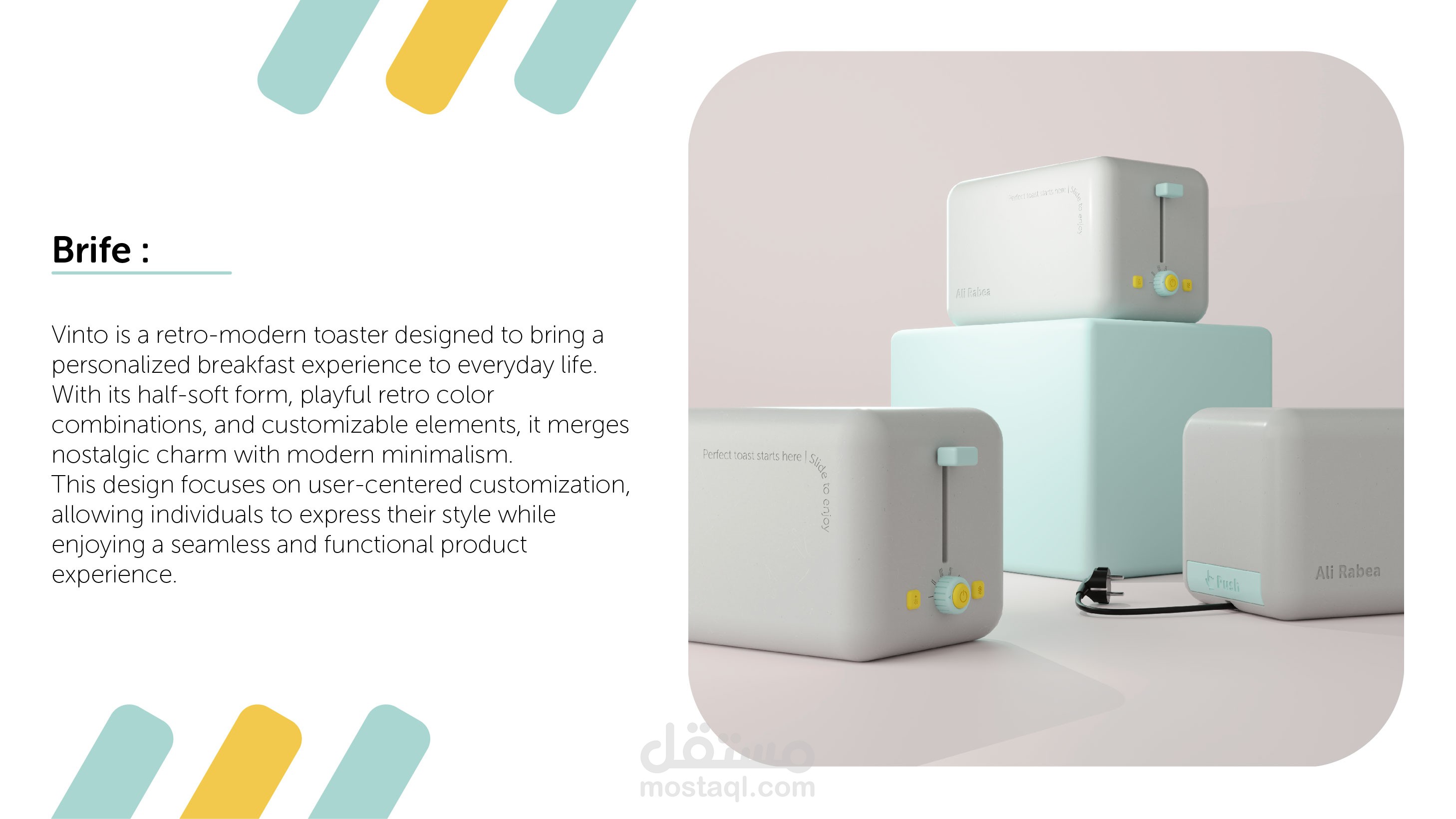 فينتو ( Vinto ) محمصة خبز تجمع بين الطابع الكلاسيكي والعصري، مصممة لتضفي لمسة شخصية على تجربة الإفطار اليومية. بفضل تصميمها شبه المرن، وألوانها الكلاسيكية الجذابة، وعناصرها القابلة للتخصيص، تمزج فينتو بين سحر الماضي وبساطة التصميم العصري. يركز هذا التصميم على التخصيص الذي يراعي احتياجات المستخدم، مما يتيح للأفراد التعبير عن أسلوبهم الخاص مع الاستمتاع بتجربة استخدام سلسة وعملية.