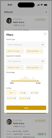 يقوم النظام بمطابقة الطلب تلقائيًا مع أقرب سيارات مرافقة متاحة ومعتمدة بناءً على الموقع، التجهيزات، والتقييم.