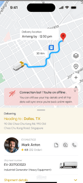 يتم تتبع الرحلة لحظيًا باستخدام الخرائط، مع دعم العمل في حالة ضعف الاتصال بالإنترنت.