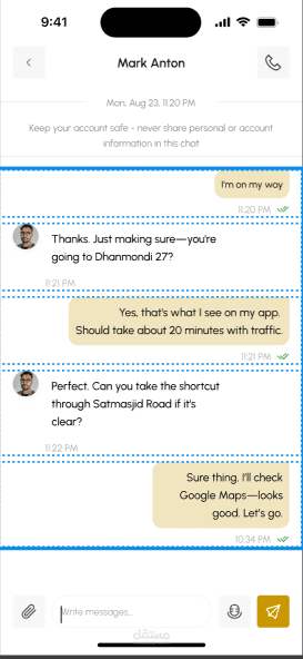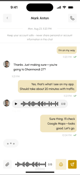 بعد انتهاء الرحلة، يتم تأكيد الخدمة، إتمام الدفع، وإتاحة التقييم للطرفين.
