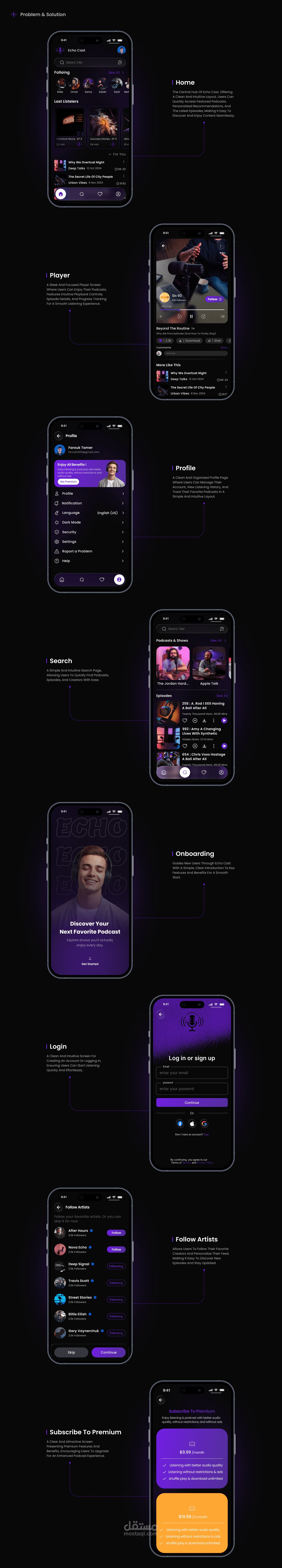 تم تنظيم التطبيق بطريقة تسمح بالوصول السريع للحلقات، البحث عن المحتوى، إدارة المفضلة، ومتابعة المبدعين بسهولة. التصميم يعكس تجربة مستخدم سلسة ويحفز التفاعل مع التطبيق، مع الحفاظ على جمالية واجهة جذابة ومتناسقة.