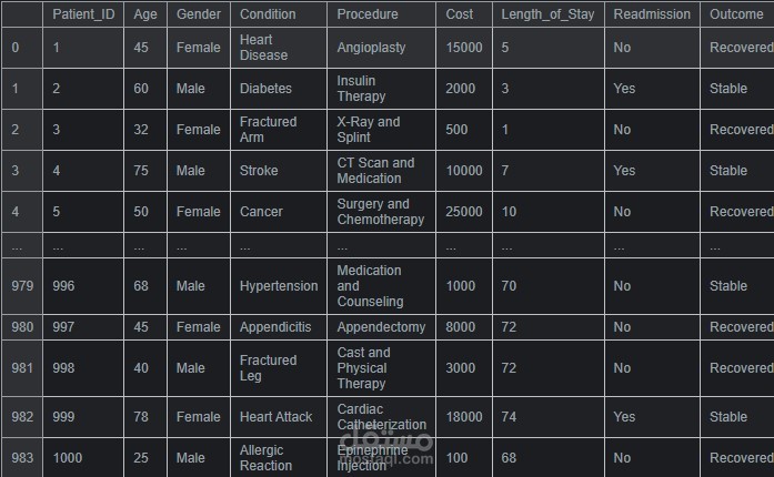 عملت على بيانات تحتوي على 10 أعمدة و 984 صف من المرضى الذين تم علاجهم وتشمل التكاليف الطبية, الحالة المرضية الحالية, العملية الجراحية اللازمة, مدة البقاء في المستشفى , المعلومات الديمةغرافية, ونتيجة العلاج إلخ. الهدف من المشروع هو استخراج أنماط تساعد على فعالية العلاجات المختلفة.