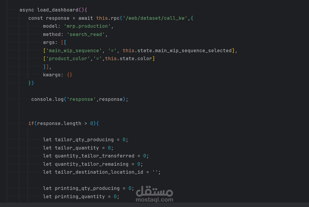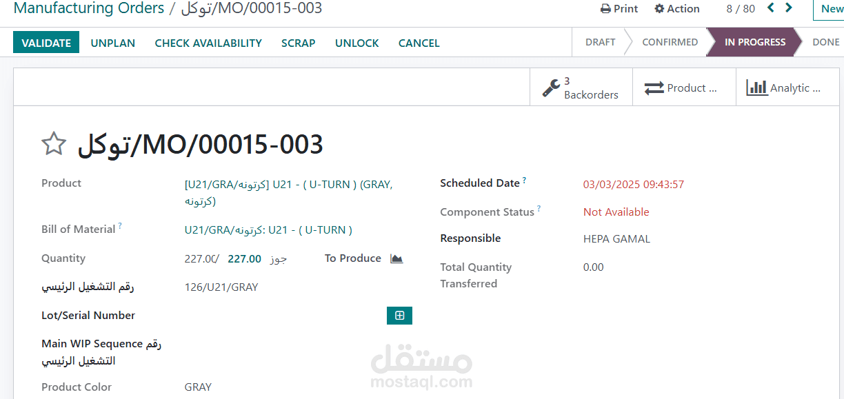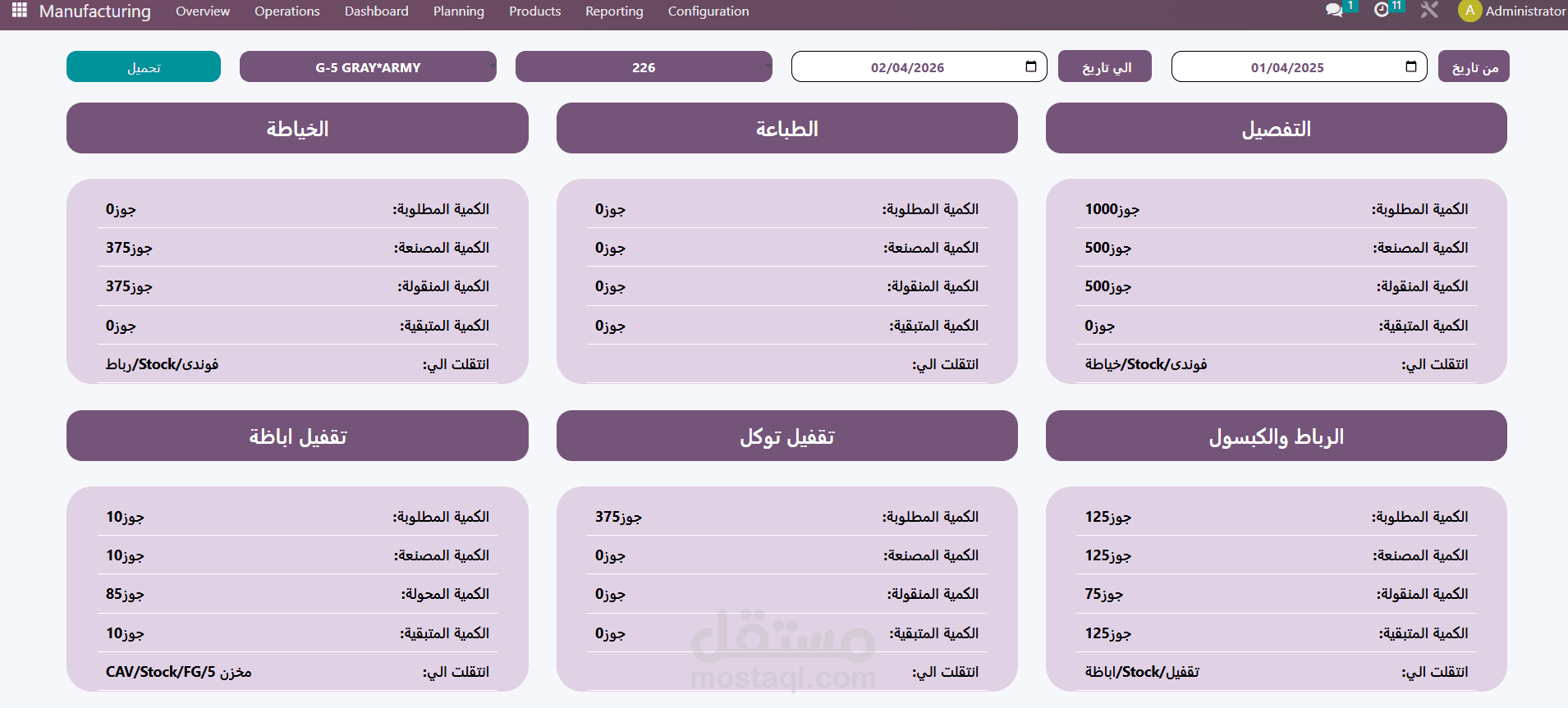 The dashboard provides a clear visualization of the product manufacturing stages, including the produced quantities at each stage and the quantities transferred to subsequent departments.