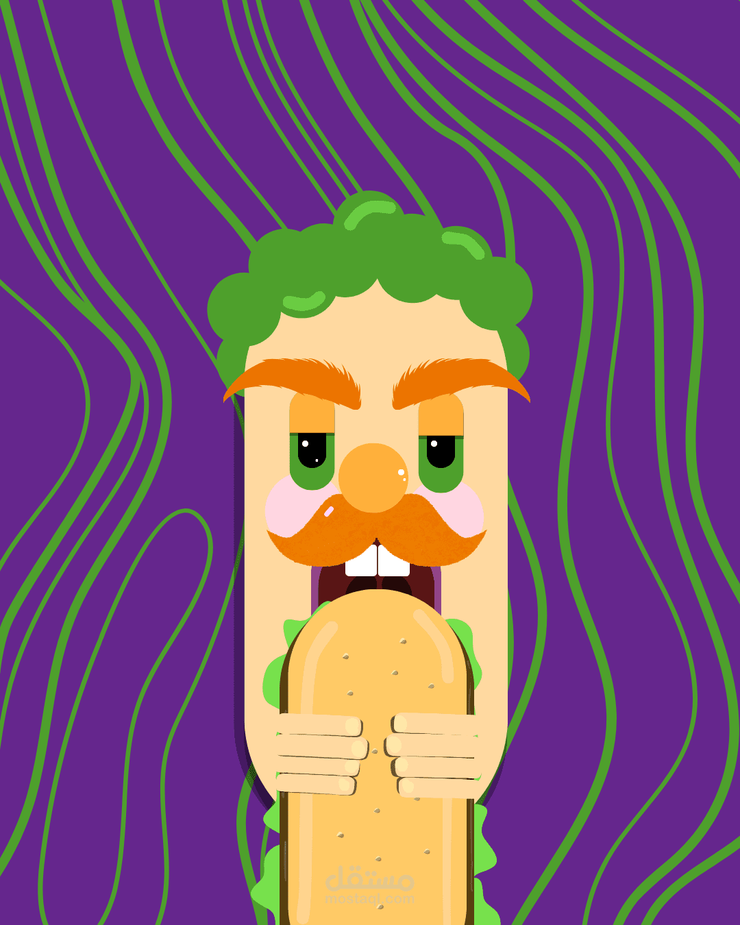 تم تنفيذ التصميم بألوان جريئة، ستايل عصري، وتعبيرات كراكتر مناسبة لبراندات الأكل السريعة والمطاعم الشبابية.