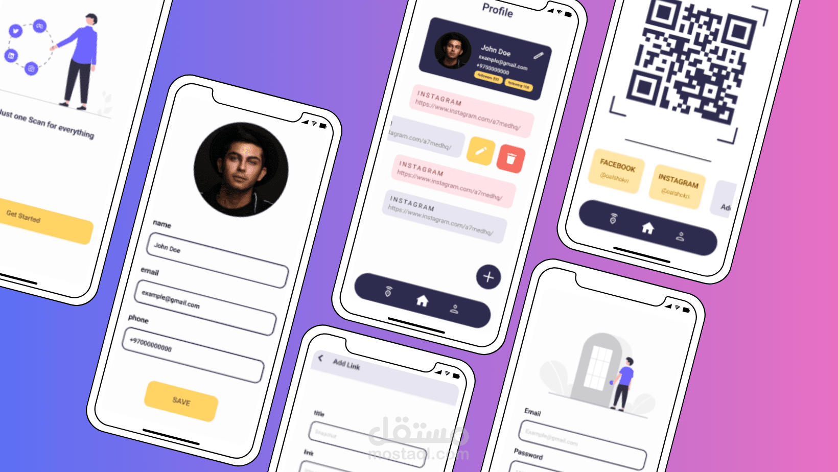 The application also allows users to exchange profiles by scanning QR codes, receive notifications when nearby users share their profiles, and save shared profiles as contacts inside the app.