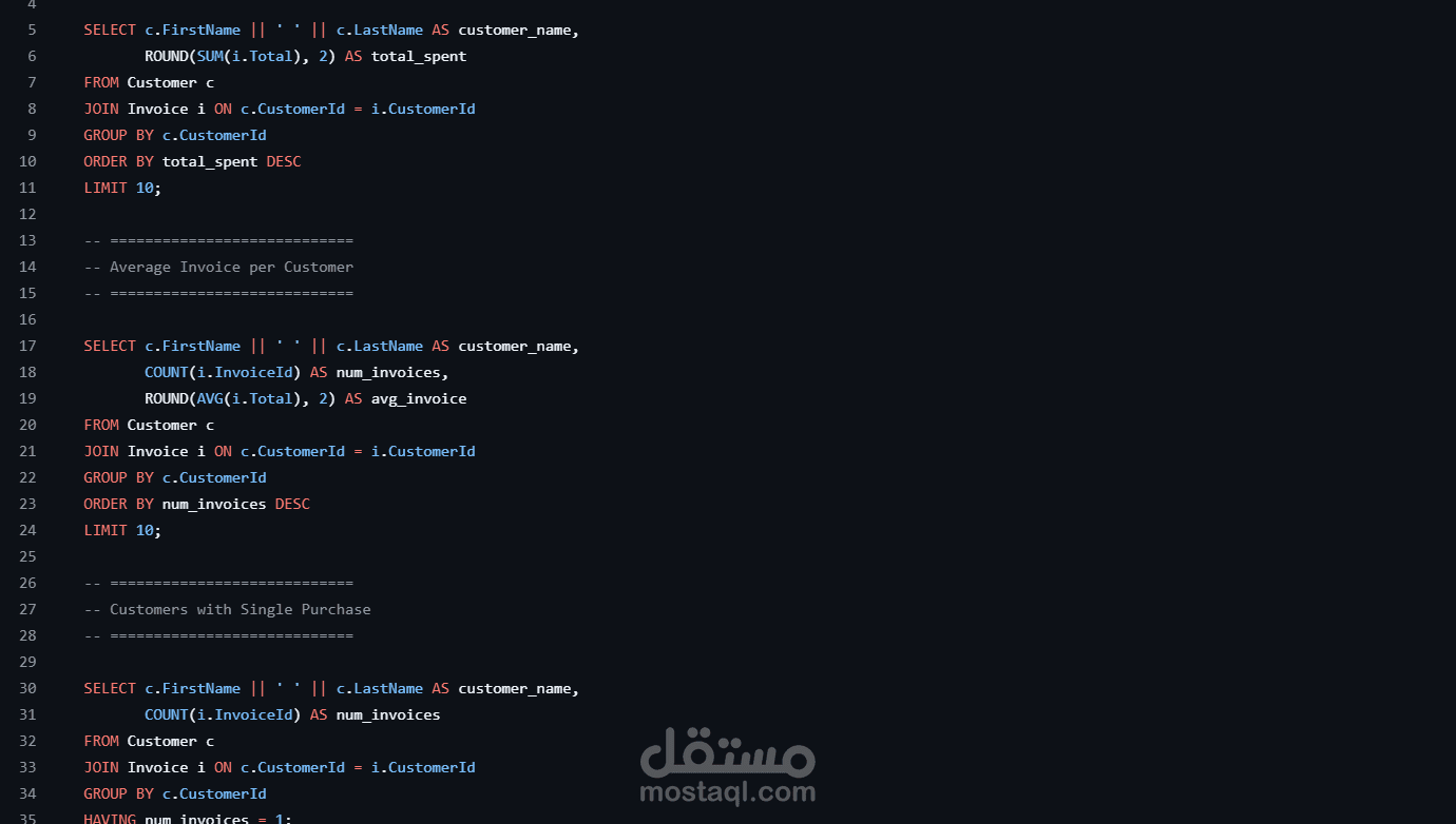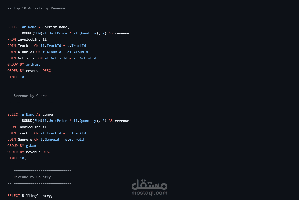 مشروع تحليل بيانات باستخدام SQL على قاعدة بيانات Chinook، يهدف لاستخراج معلومات وتقارير تساعد في فهم المبيعات والعملاء والأداء التجاري لمتجر موسيقى. يحتوي على مجموعة استعلامات SQL منظمة لتحليل الإيرادات، أكثر المنتجات مبيعًا، أفضل العملاء، وتقديم رؤى تدعم اتخاذ القرار.