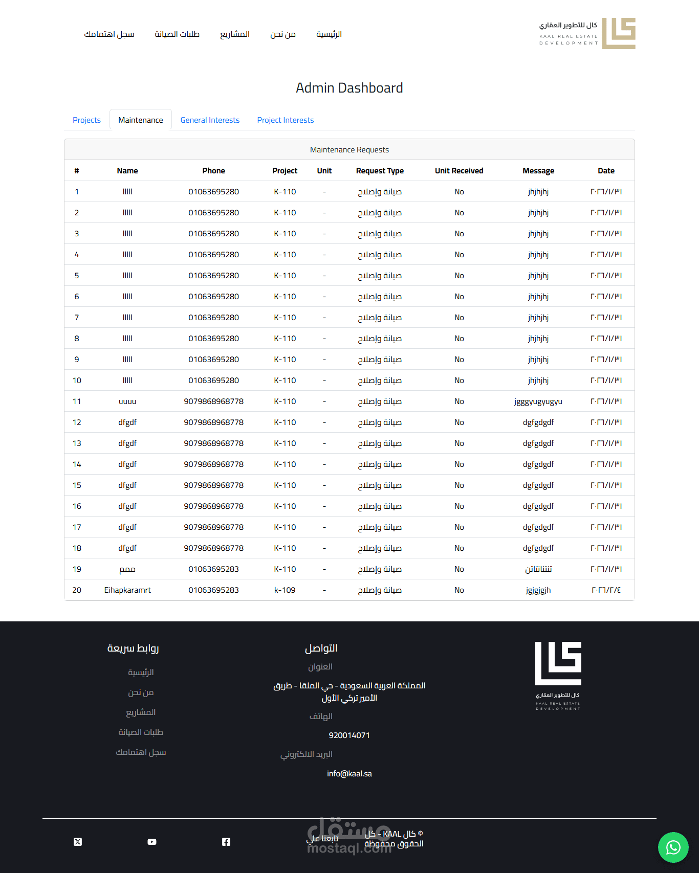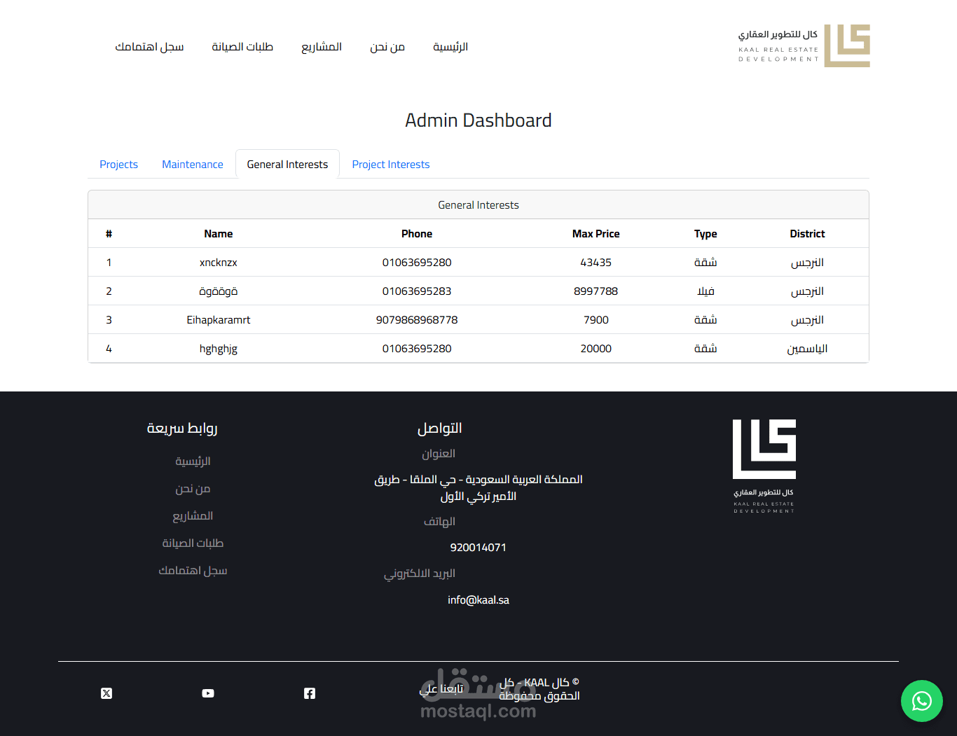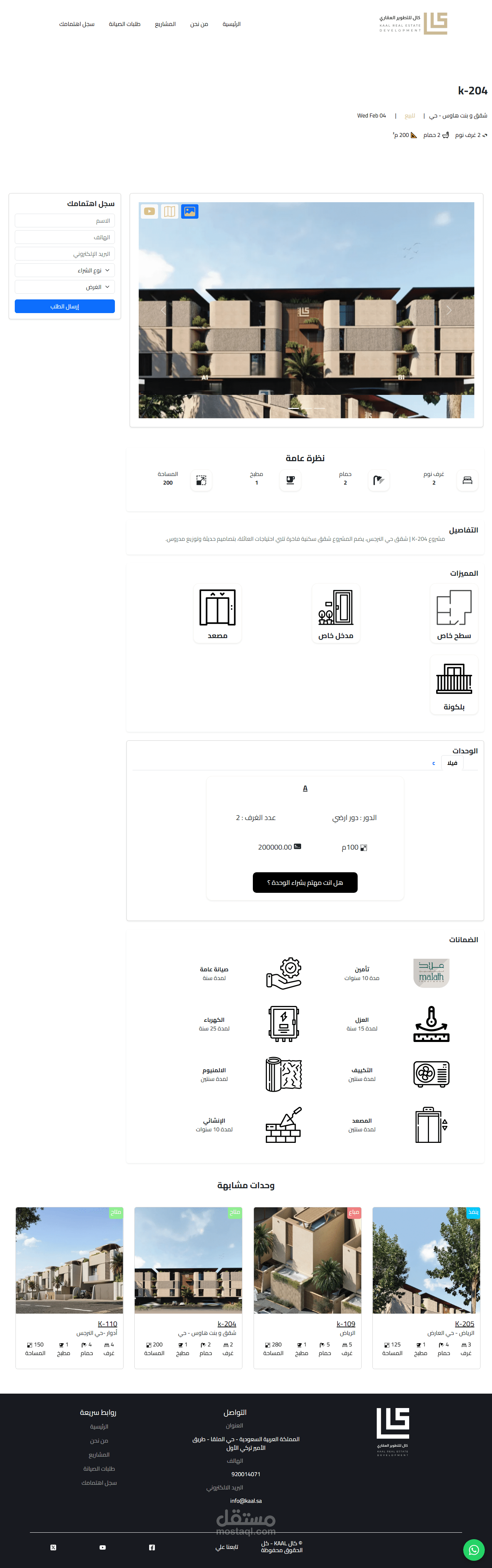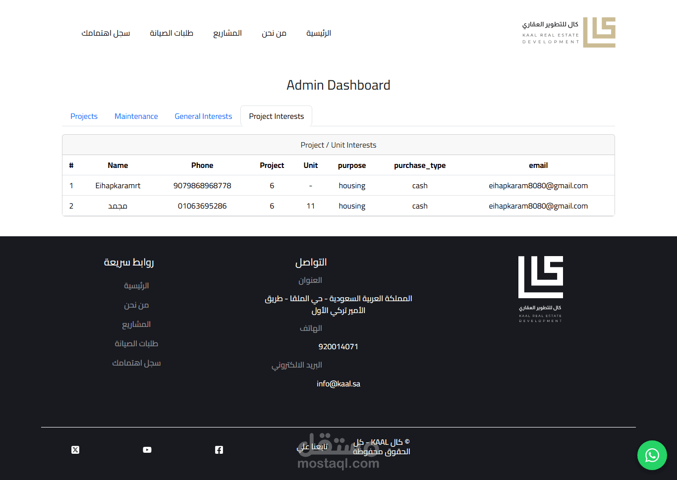 The backend was built using Laravel (PHP), with MySQL as the database system for securely and efficiently managing data related to real estate projects, units, maintenance requests, and user interests.