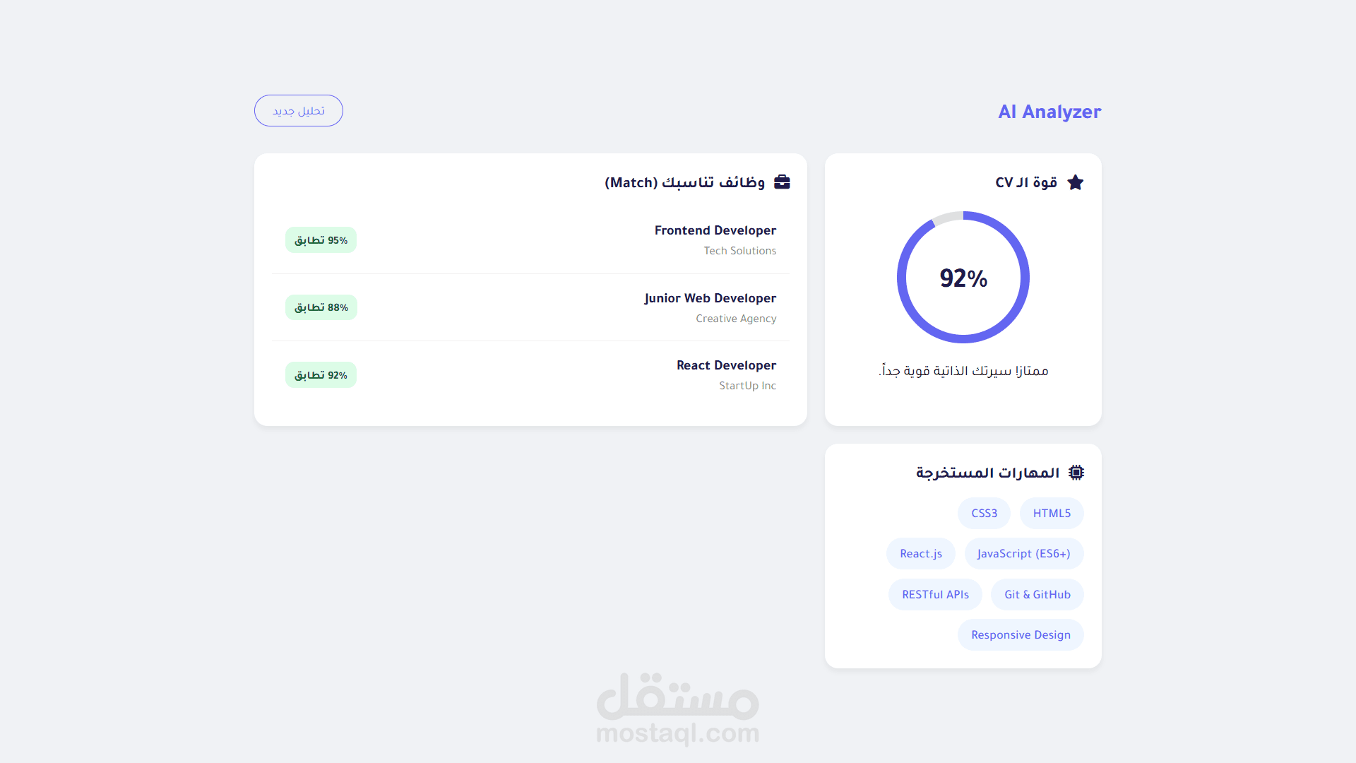 An interactive web application simulating AI resume analysis. It extracts skills, calculates ATS scores, and suggests tailored job opportunities using advanced JavaScript logic and a modern UI. (تطبيق ويب تفاعلي يحاكي تحليل السير الذاتية بالذكاء الاصطناعي. يستخرج المهارات، يحسب تقييم الـ ATS، ويقترح وظائف مخصصة باستخدام منطق جافاسكريبت متقدم وواجهة عصرية.)