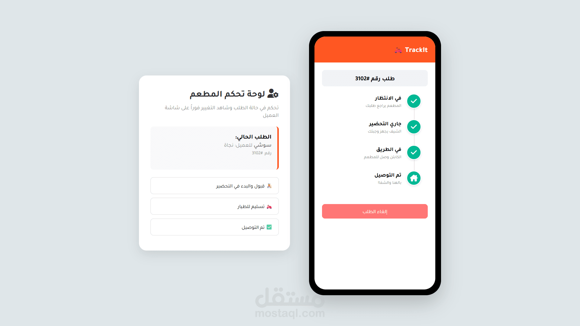 A dual-interface web application that simulates real-time order tracking. It features a customer view and an admin dashboard, using advanced DOM manipulation to update statuses instantly without page reloads. (تطبيق ويب بواجهة مزدوجة يحاكي تتبع الطلبات في الوقت الفعلي. يجمع بين واجهة العميل ولوحة تحكم الإدارة، مستخدماً معالجة متقدمة للـ DOM لتحديث الحالات فورياً بدون إعادة تحميل الصفحة.)