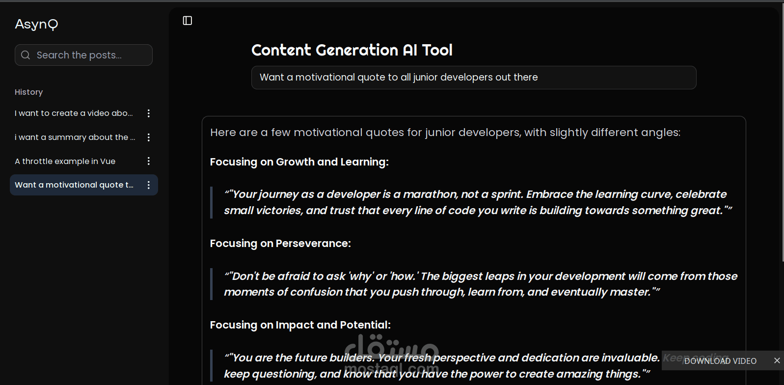 نبذة عن المشروع: منصة AsynQ هي تطبيق ويب متكامل (Full Stack) يهدف إلى تسهيل صناعة المحتوى باستخدام الذكاء الاصطناعي. تم بناء المشروع من الصفر ليكون سريعاً، آمناً، وقابلاً للتوسع، مع التركيز على تجربة مستخدم سلسة وأداء عالي.