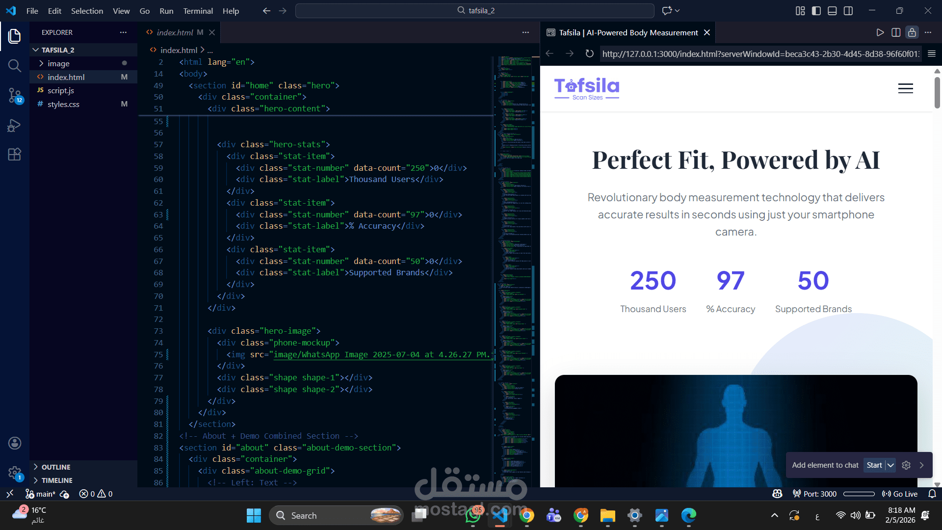 Tafsila هي صفحة هبوط (Landing Page) تم تصميمها لعرض فكرة مشروع يعتمد على الذكاء الاصطناعي لقياس أبعاد الجسم بدقة باستخدام كاميرا الهاتف.