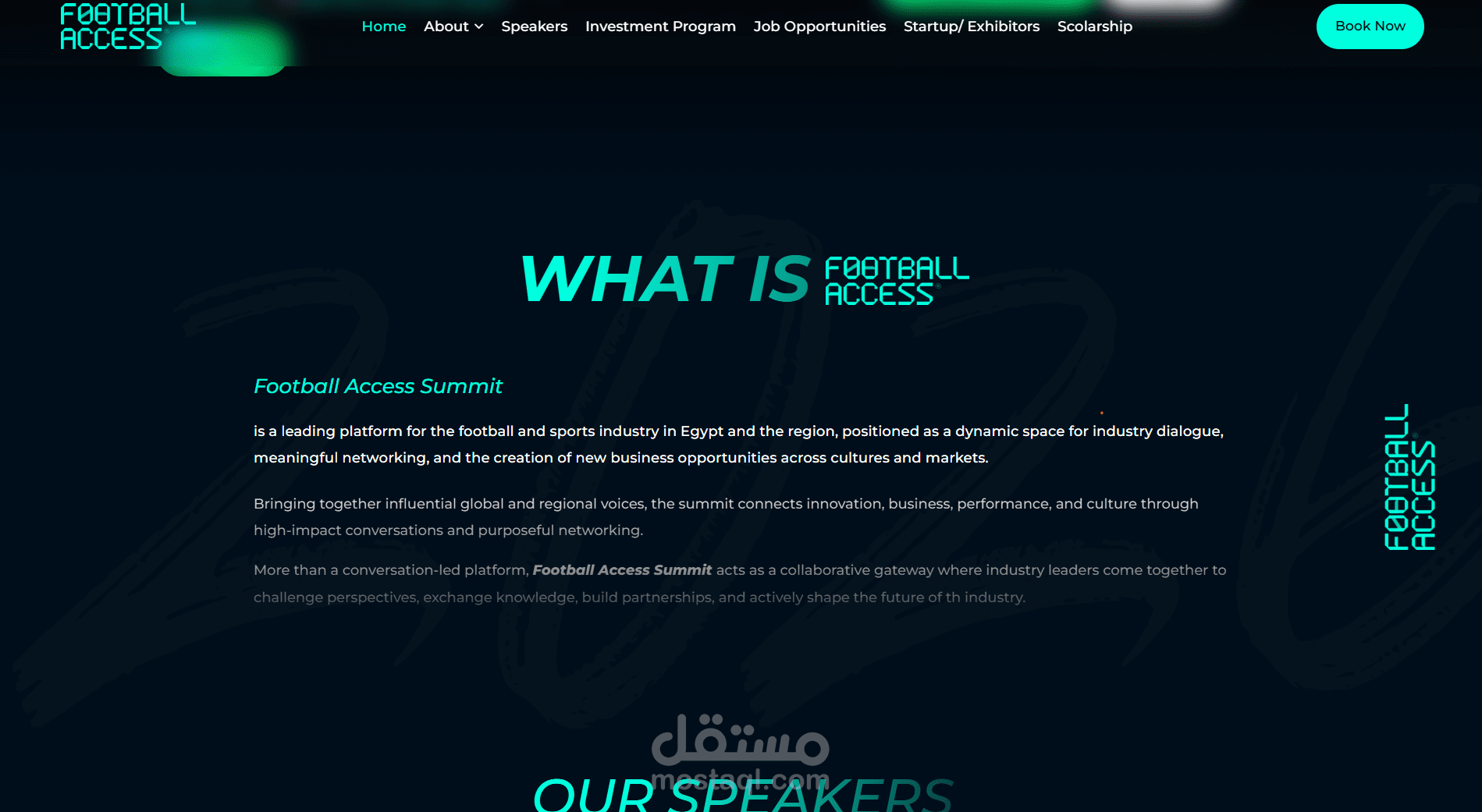 موقع football access summit واحد من اكبر احداث كرة القدم في المجتمع العربي و الافريقي و يضم كبار و عمالقة كرة القدم في العالم مثل خوليت و فابيو كابيلو و ايضا الاف الزوار كل عام و قمت ببناء الموقع بالكامل بوردبرريس و اليمنتور المجاني و الموقع مصمم ليتحمل كثافة عالية من المستخدمين حتي يتحمل حملات الدعايا علي وسائل التواصل الاجتماعي و ايضا اضافات css و js عديدة لتحسين و اضافة لمسات عصرية و مختلفه ع الموقع + اكواد php خاصة مضافه بداخله