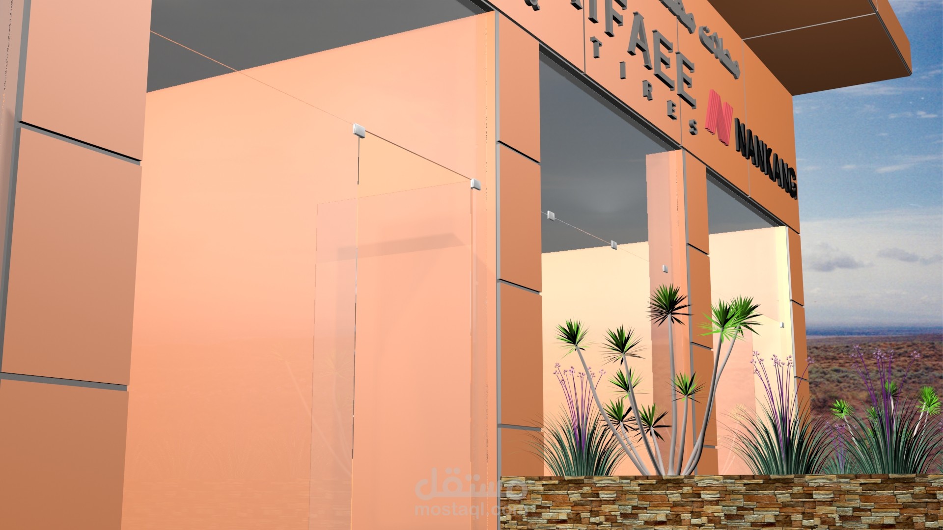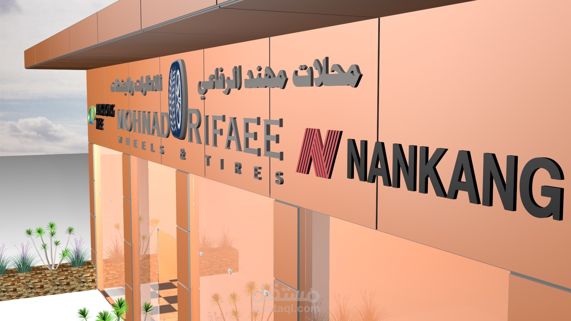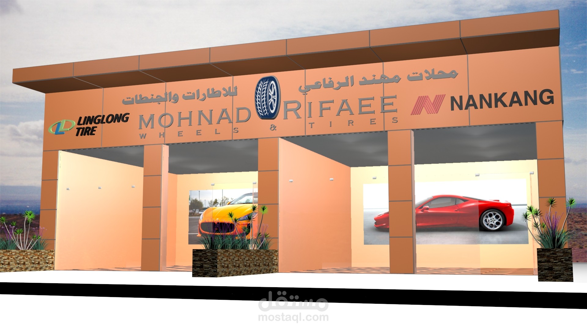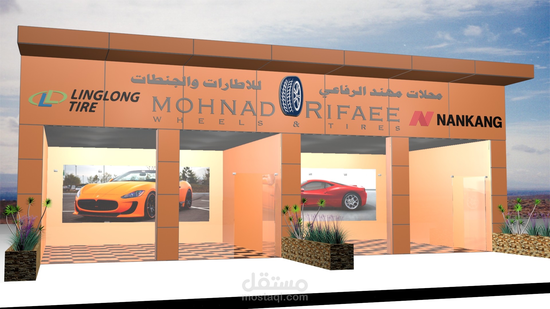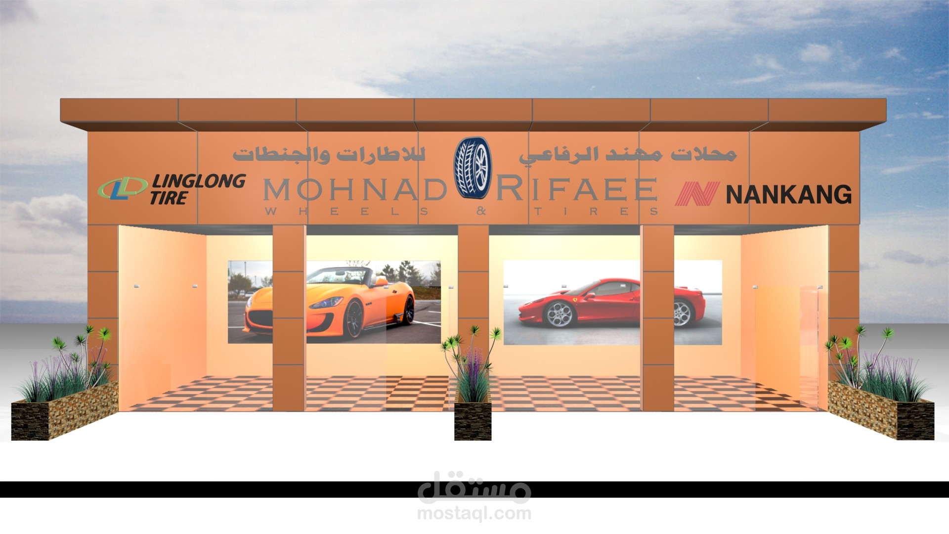تصميم ثلاثي الابعاد لمحل بيع اطارات و مستلزماتها