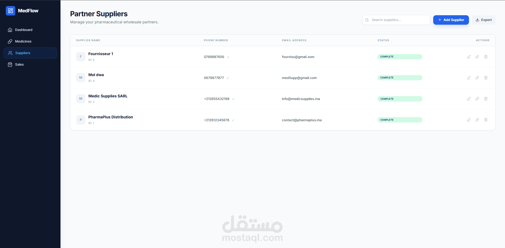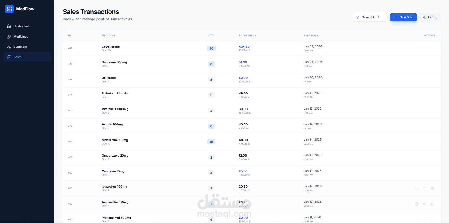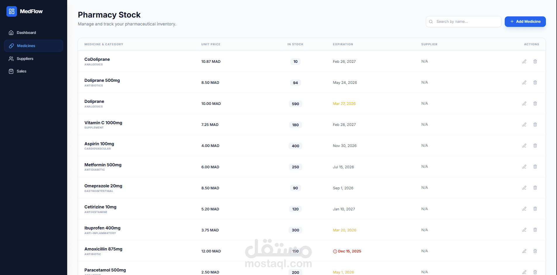 MedFlow هو نظام متكامل لإدارة الصيدليات يهدف إلى تسهيل وتنظيم العمل اليومي داخل الصيدلية. يوفّر أدوات لإدارة المخزون، تتبع المبيعات، إدارة المورّدين، وعرض إحصائيات وتحليلات عبر لوحة تحكم واضحة وسهلة الاستخدام. تم تطويره باستخدام تقنيات ويب حديثة لضمان أداء جيد وتجربة استخدام سلسة.