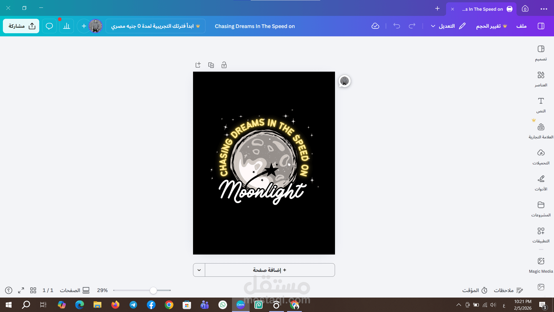 هذا العمل عبارة عن تصميم إبداعي بطابع فني مستوحى من الأجواء الليلية والخيال، يتمحور حول عنصر القمر كنقطة جذب بصرية رئيسية مع عبارة Moonlight بخط انسيابي أنيق يعكس الهدوء والرومانسية. تم دمج النص الدائري Chasing Dreams in the Speed on حول القمر لإضفاء إحساس بالحركة والطموح، مع إضافة النجوم والتوهج الضوئي لتعزيز عمق المشهد وإبراز الأجواء الحالمة.