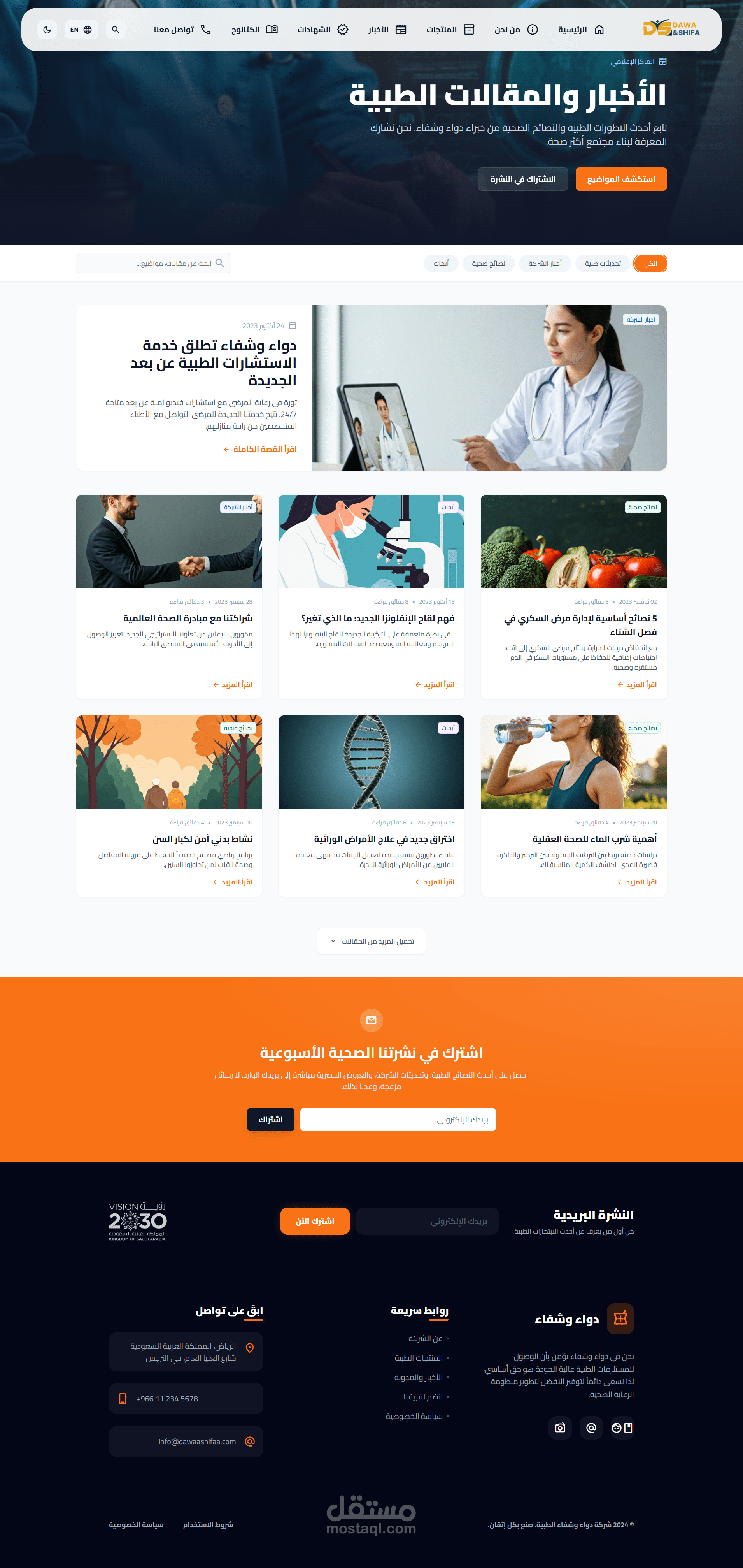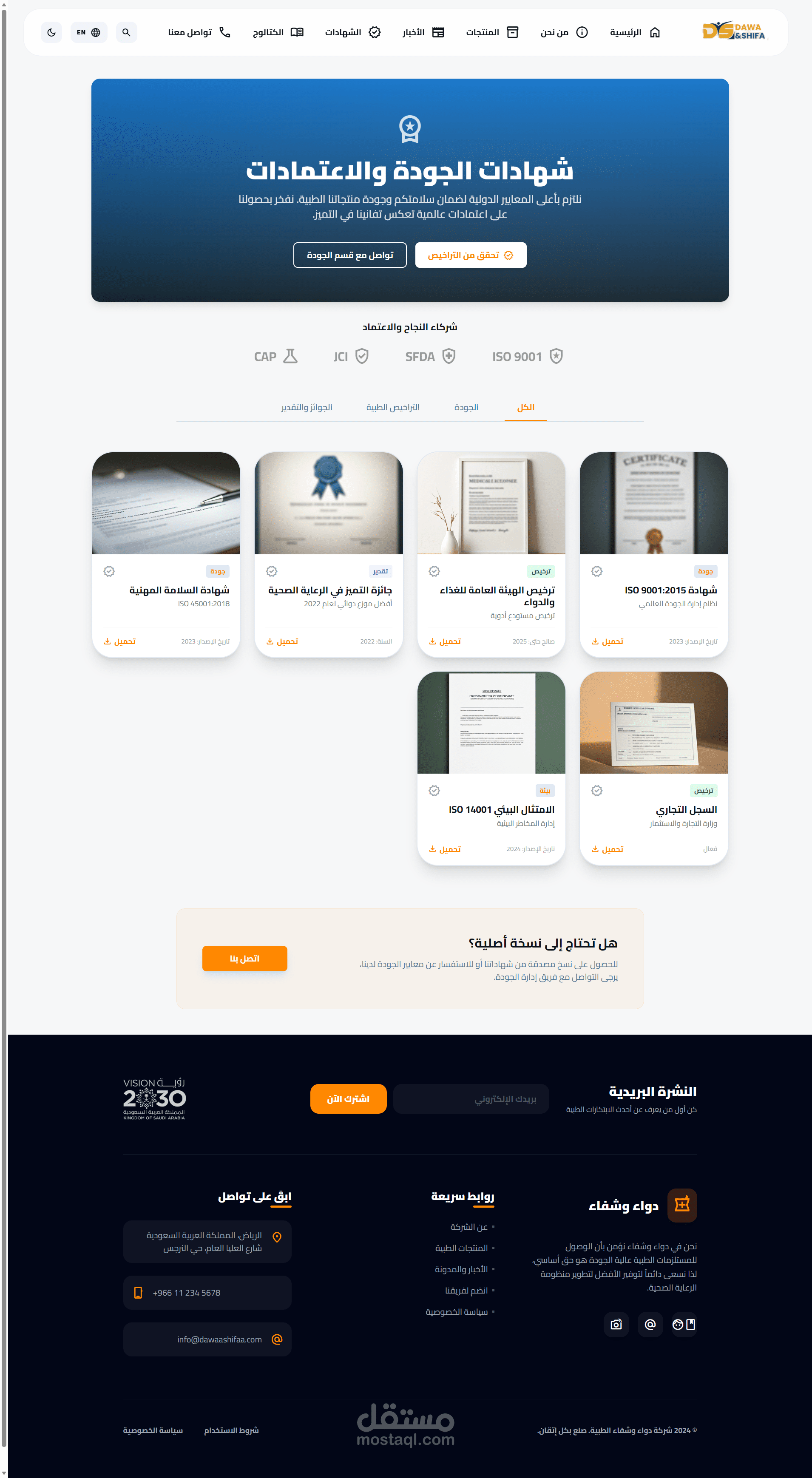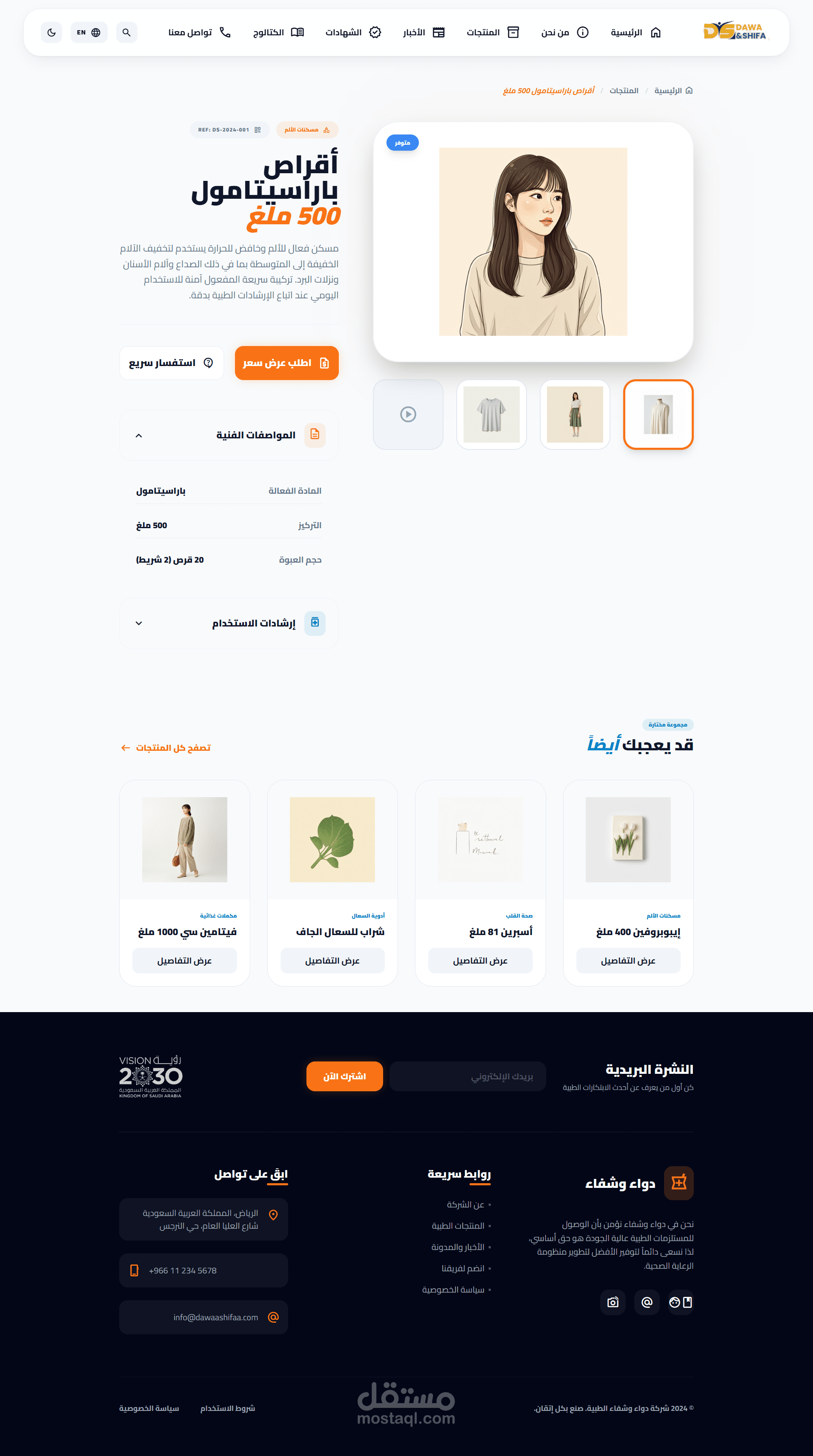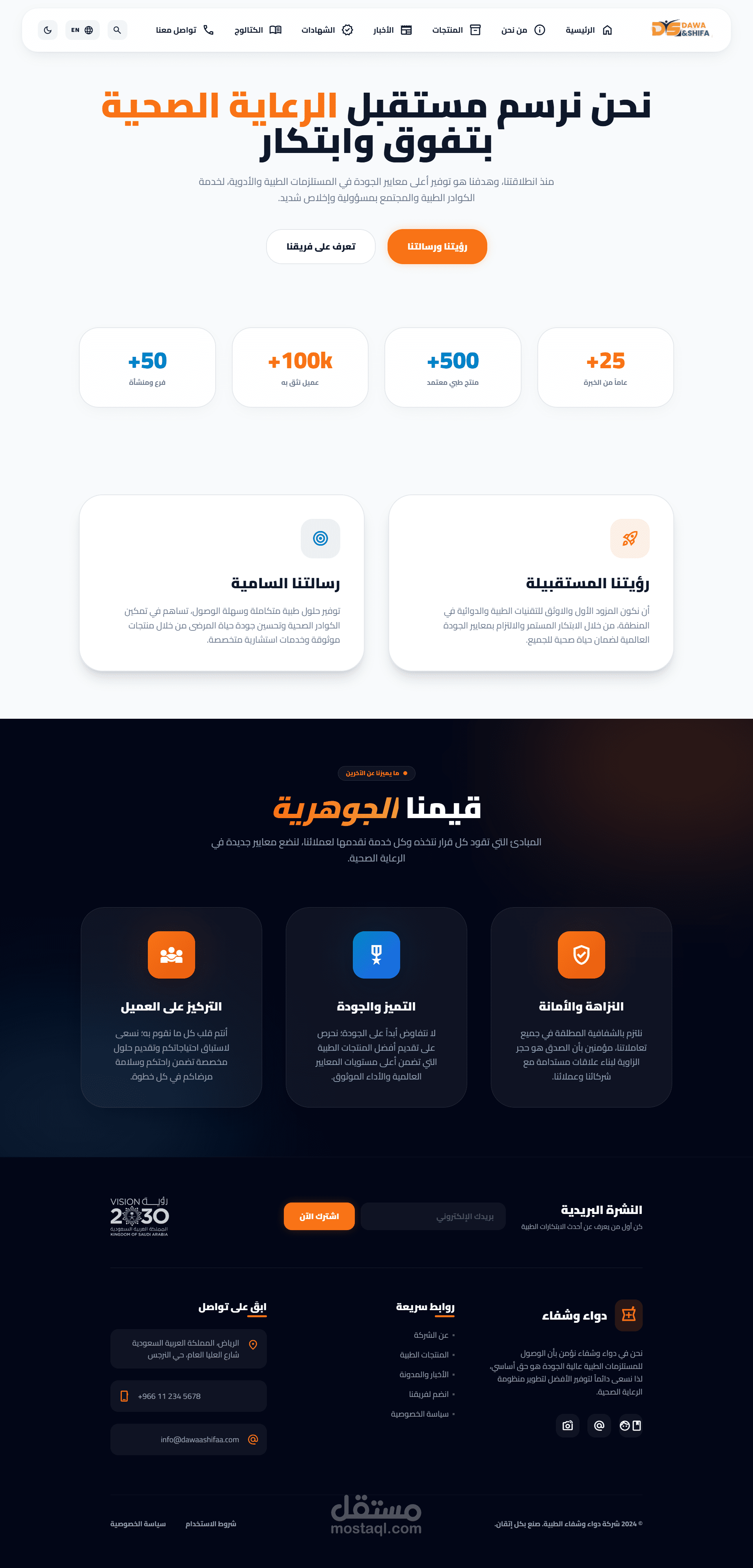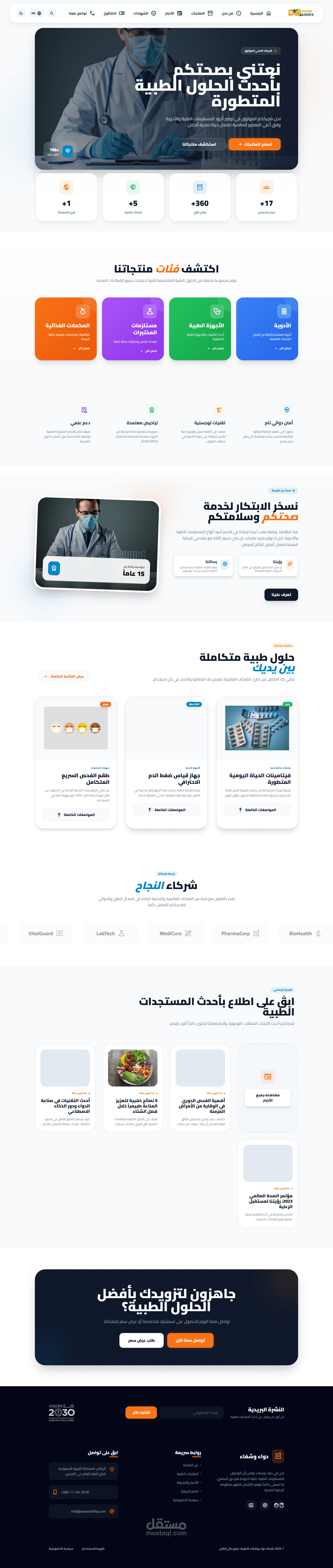 Dawa & Shifa is a high-end, professional medical platform designed to bridge the gap between healthcare providers and advanced medical solutions. The project features a modern, clean UI/UX optimized for the pharmaceutical and medical equipment industry, aligning with Saudi Vision 2030 standards.