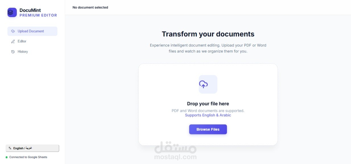 A professional web-based system to upload, analyze, edit, and regenerate PDF and Word documents with full English and Arabic support.