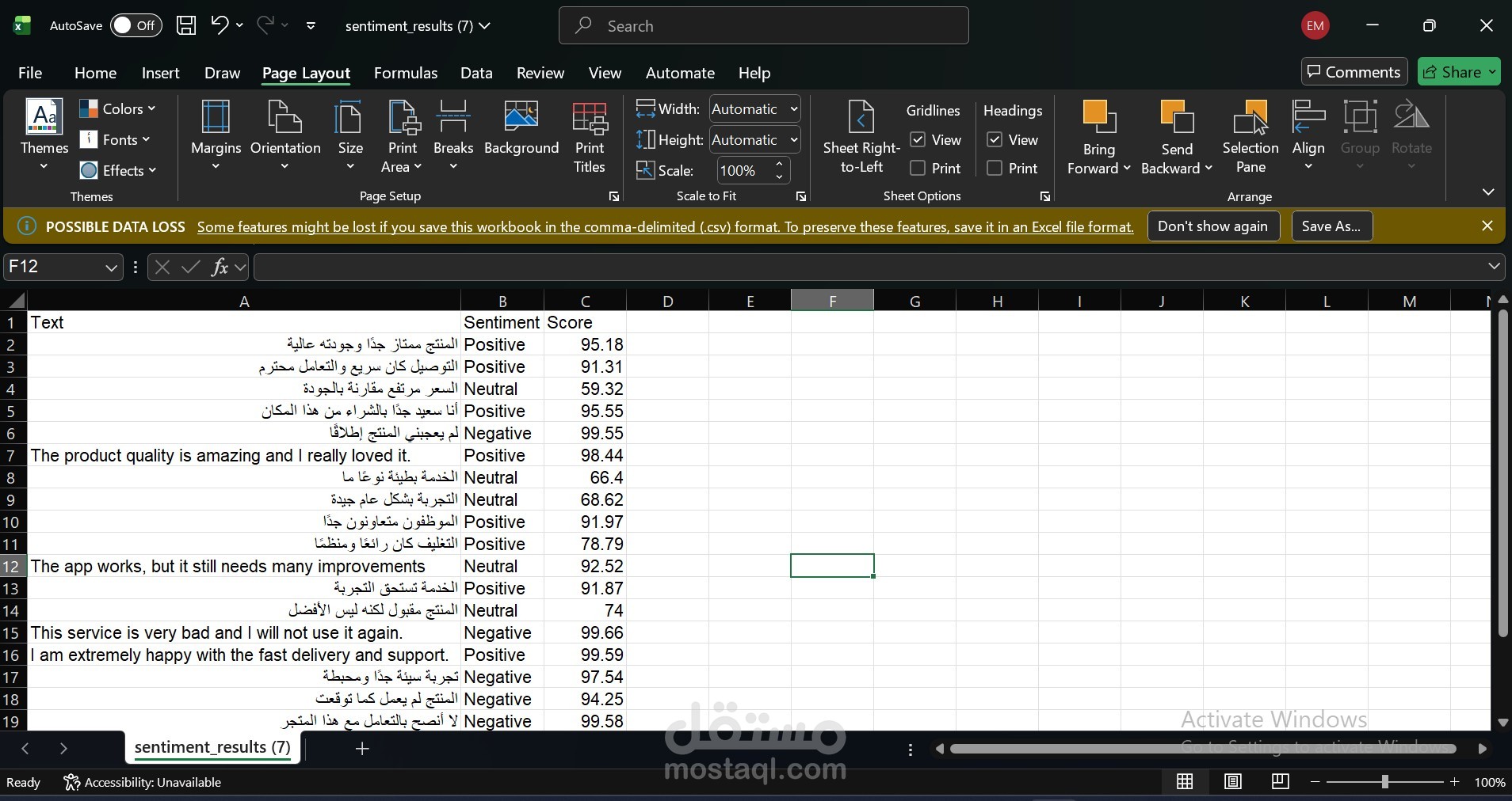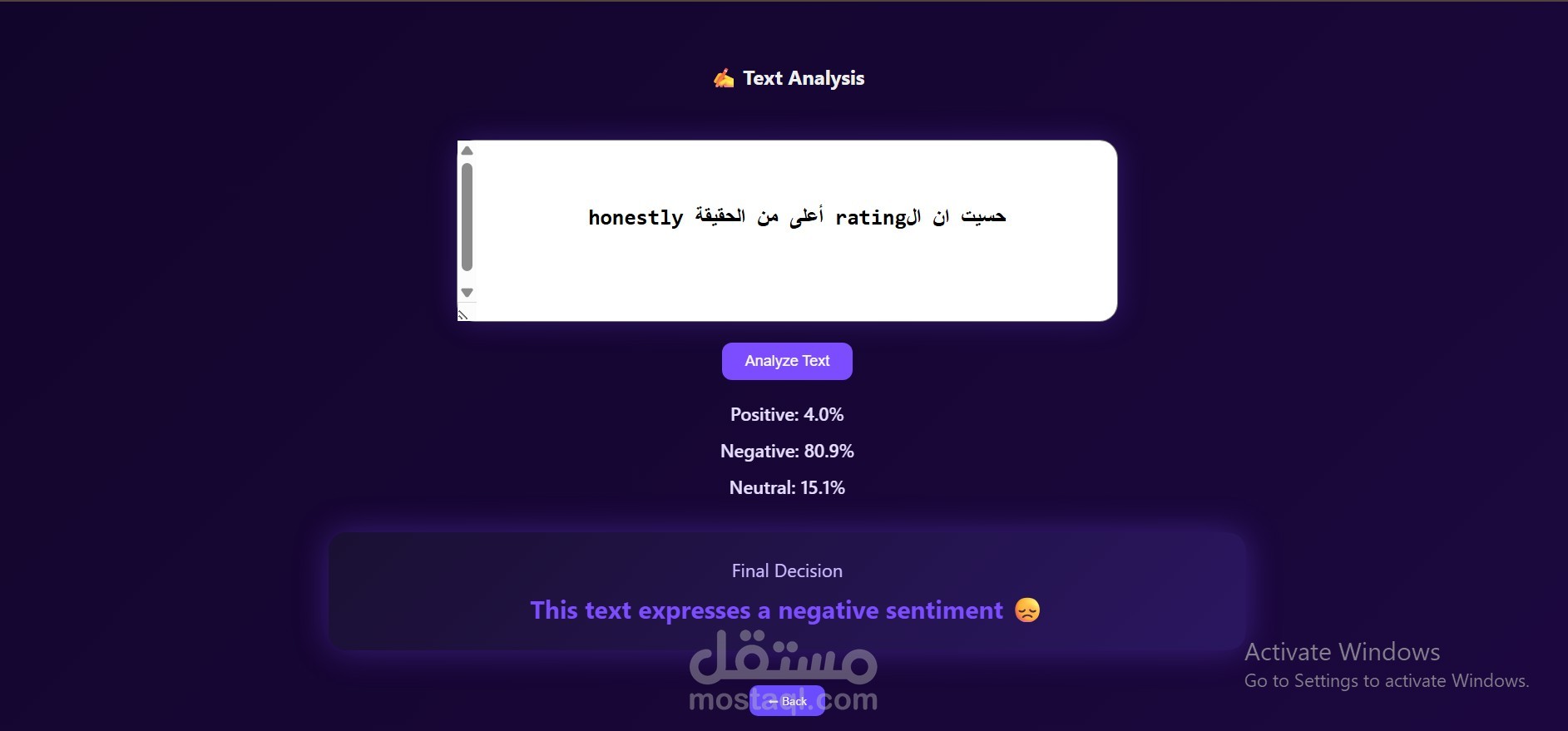 Developed a multilingual Sentiment Analysis application to classify Arabic and English text into Positive, Neutral, and Negative categories. Implemented using XLM-RoBERTa and enhanced Arabic training data through back translation to improve model generalization, leveraging a dataset of 115K Arabic and 150K English samples. Deployed the system using FastAPI and Docker to ensure scalable and efficient inference. Achieved 80% accuracy and a 79.4% F1-score with consistent performance across sentiment classes.