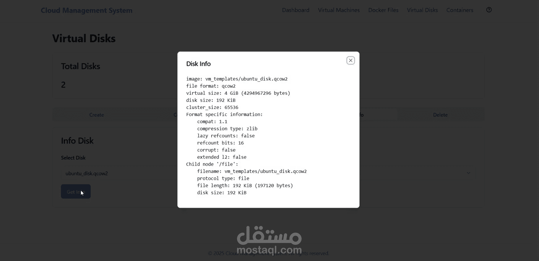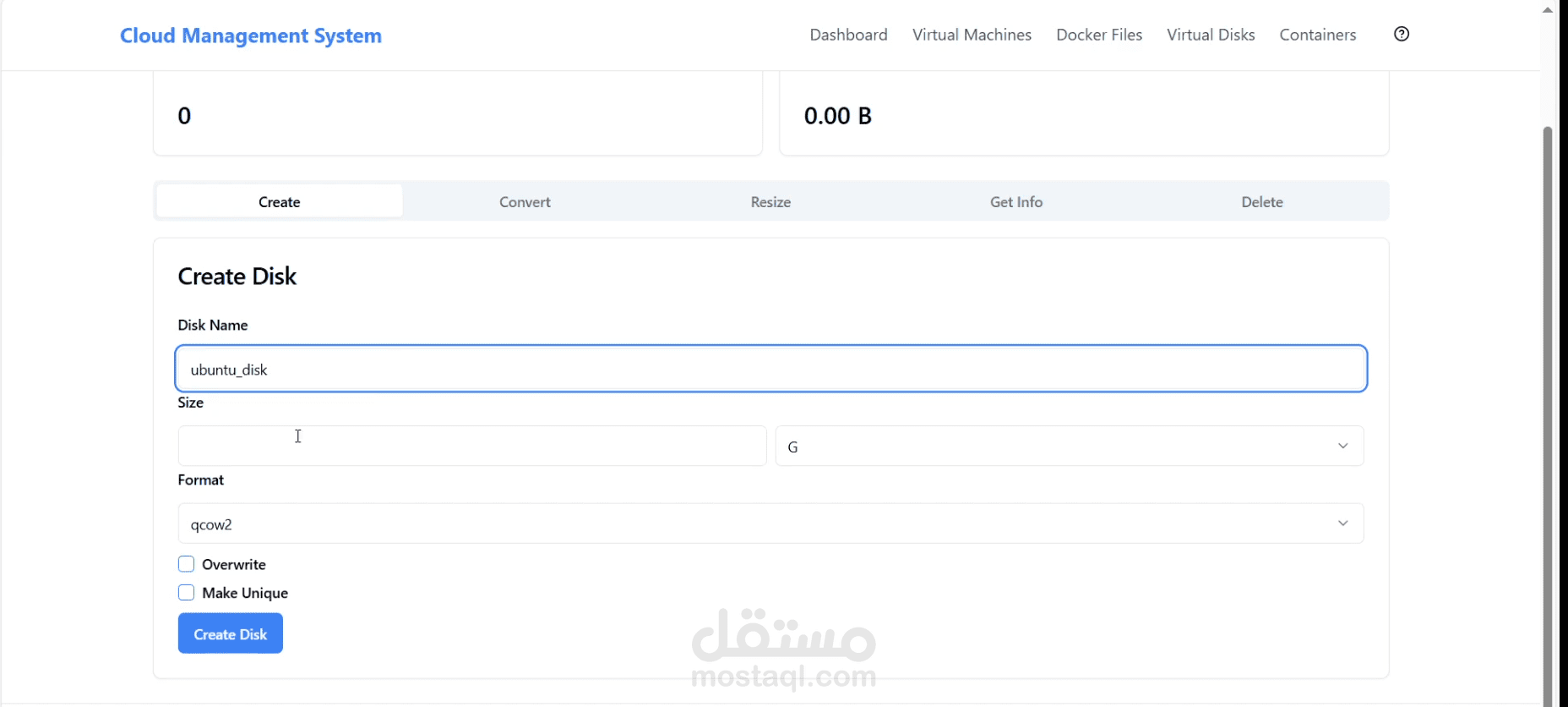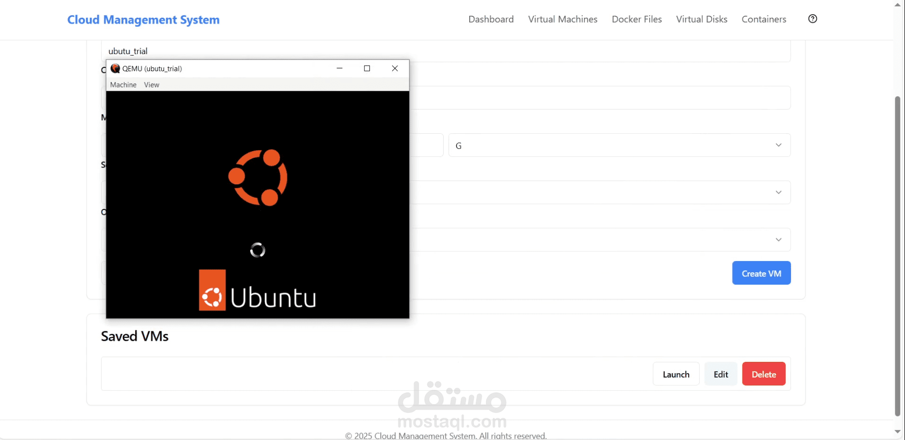 طورت نظامًا متكاملًا لإدارة الأقراص الافتراضية والآلات الافتراضية (VMs) باستخدام QEMU وPython، مع دعم كامل لإدارة Docker من خلال واجهة Backend مرنة وقابلة للتوسع. يشمل المشروع إدارة الأقراص (إنشاء، تحويل، تغيير الحجم، الحصول على معلومات، وحذف)، إدارة الآلات الافتراضية (حفظ، تحميل، تعديل، وتشغيل VMs)، وإدارة Docker (سحب الصور، تشغيل وإيقاف الحاويات، وإنشاء Dockerfile). تم تصميم النظام بشكل موديولار مع وحدات للتحقق من الصحة والتعامل مع الأخطاء، مع اختبارات وحدة شاملة لضمان استقرار وسلامة العمليات. كما تم دمج واجهة Frontend باستخدام React وTypeScript وTailwind لعرض الأقراص، الآلات، وحاويات Docker بطريقة تفاعلية وسهلة الاستخدام.