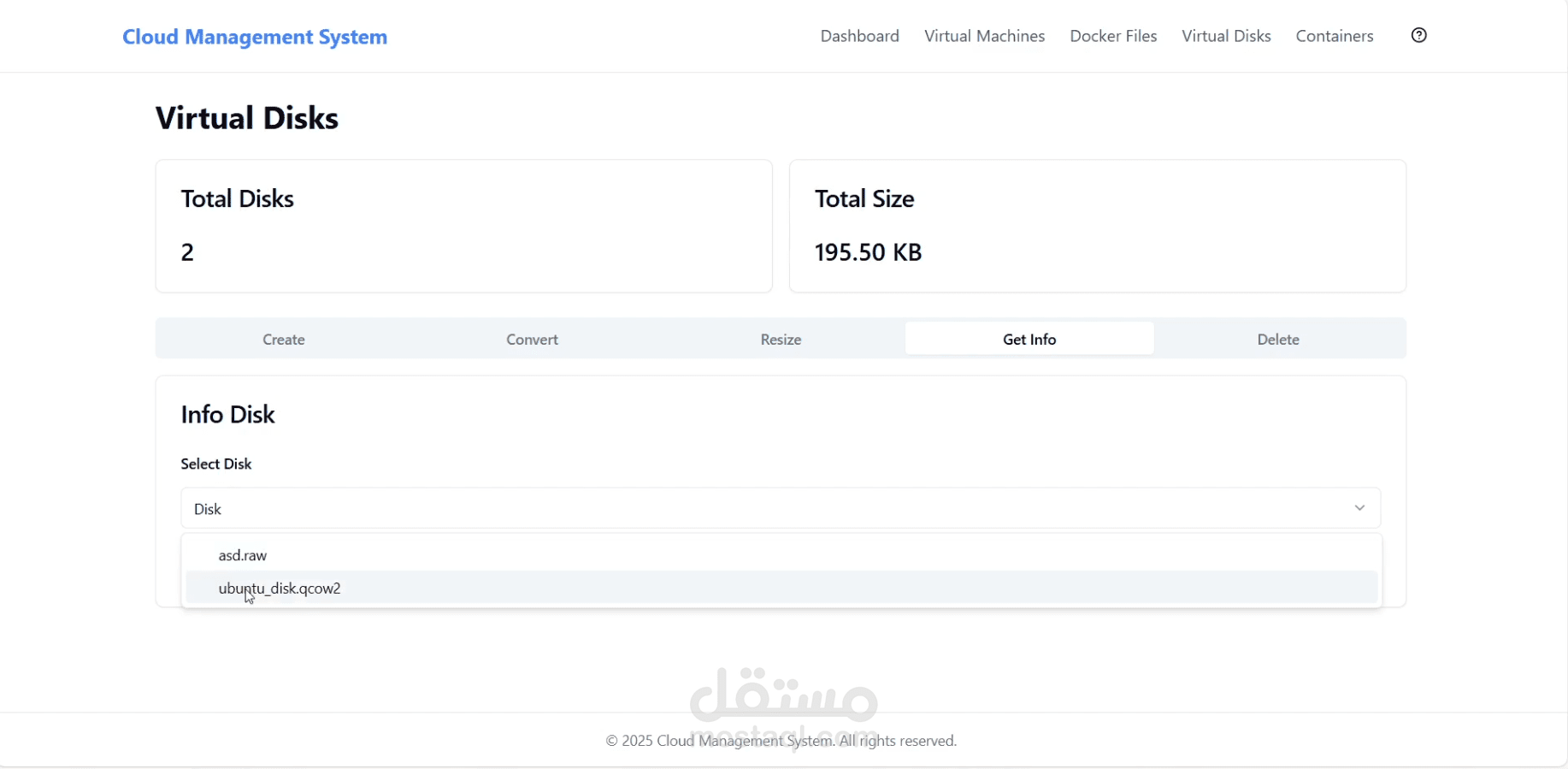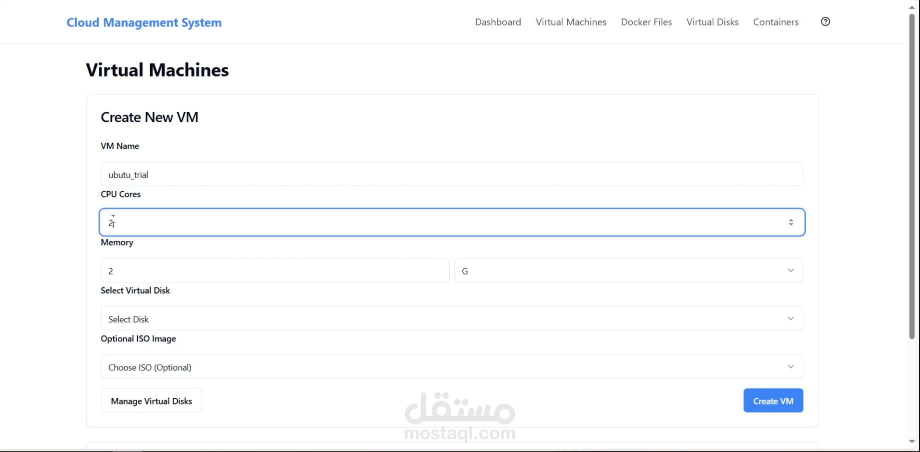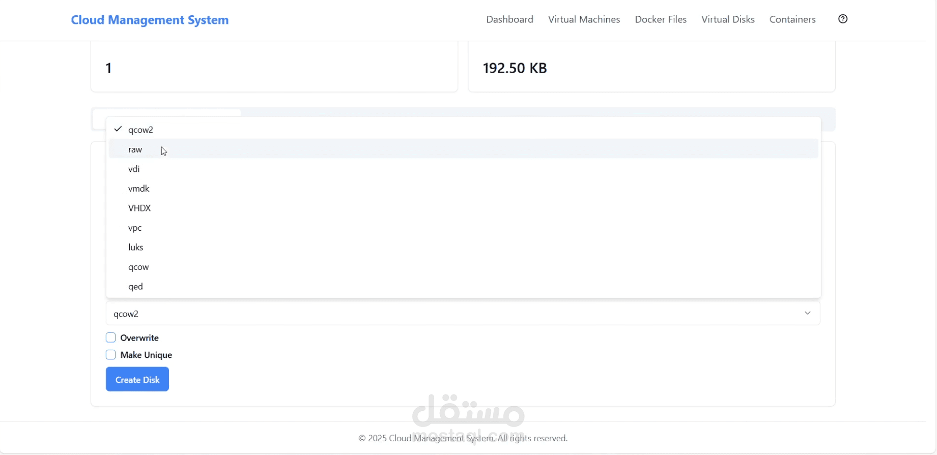 طورت نظامًا متكاملًا لإدارة الأقراص الافتراضية والآلات الافتراضية (VMs) باستخدام QEMU وPython، مع دعم كامل لإدارة Docker من خلال واجهة Backend مرنة وقابلة للتوسع. يشمل المشروع إدارة الأقراص (إنشاء، تحويل، تغيير الحجم، الحصول على معلومات، وحذف)، إدارة الآلات الافتراضية (حفظ، تحميل، تعديل، وتشغيل VMs)، وإدارة Docker (سحب الصور، تشغيل وإيقاف الحاويات، وإنشاء Dockerfile). تم تصميم النظام بشكل موديولار مع وحدات للتحقق من الصحة والتعامل مع الأخطاء، مع اختبارات وحدة شاملة لضمان استقرار وسلامة العمليات. كما تم دمج واجهة Frontend باستخدام React وTypeScript وTailwind لعرض الأقراص، الآلات، وحاويات Docker بطريقة تفاعلية وسهلة الاستخدام.