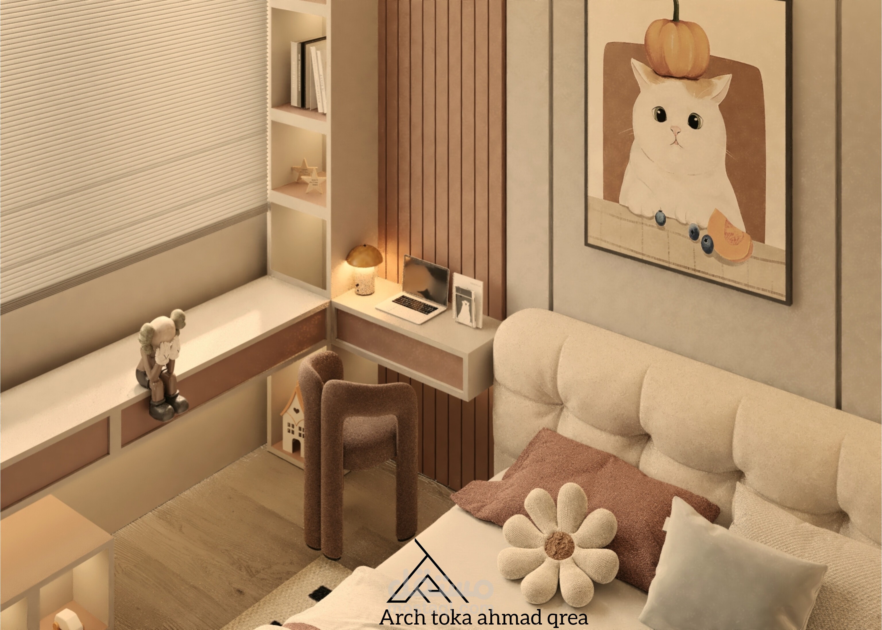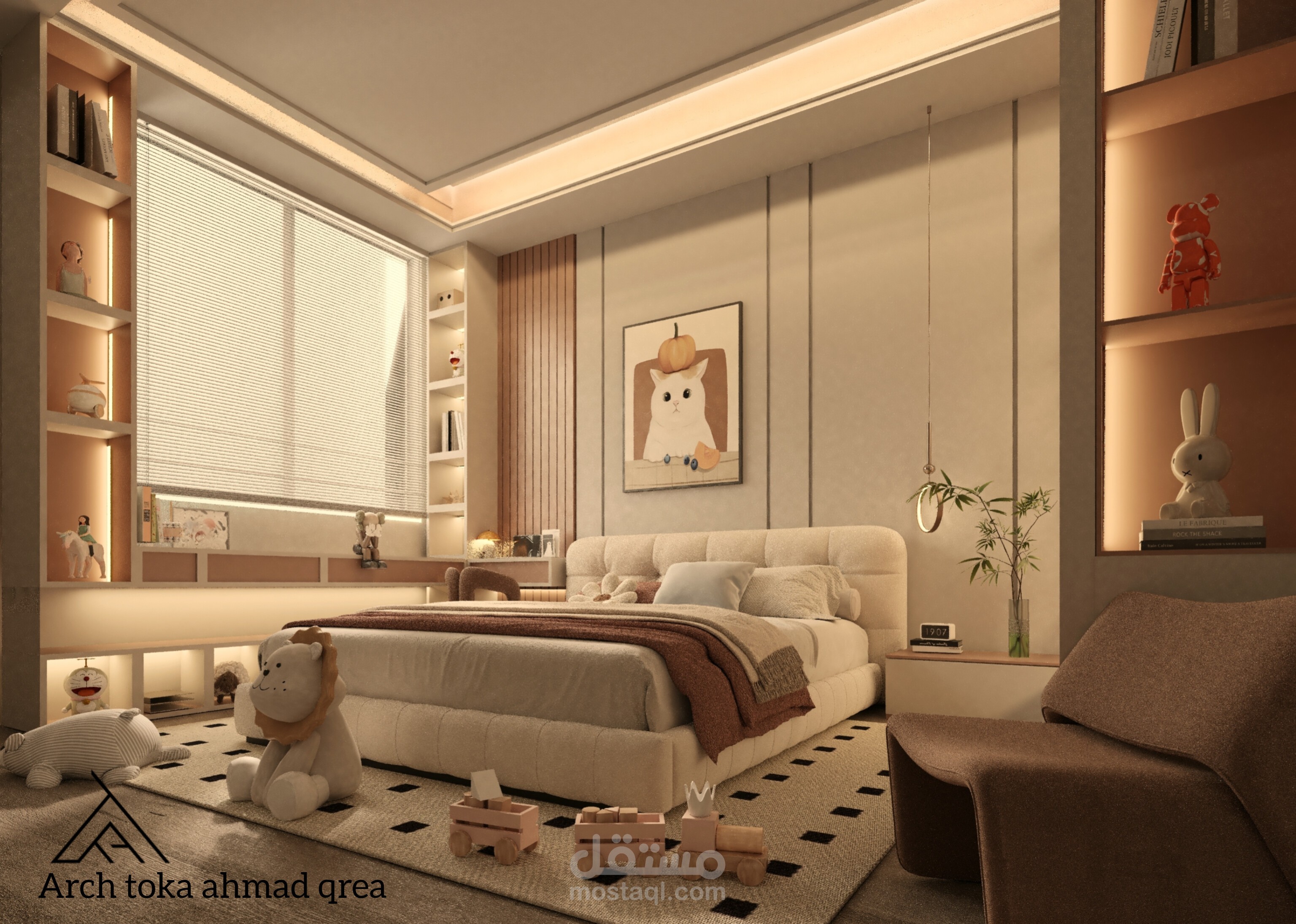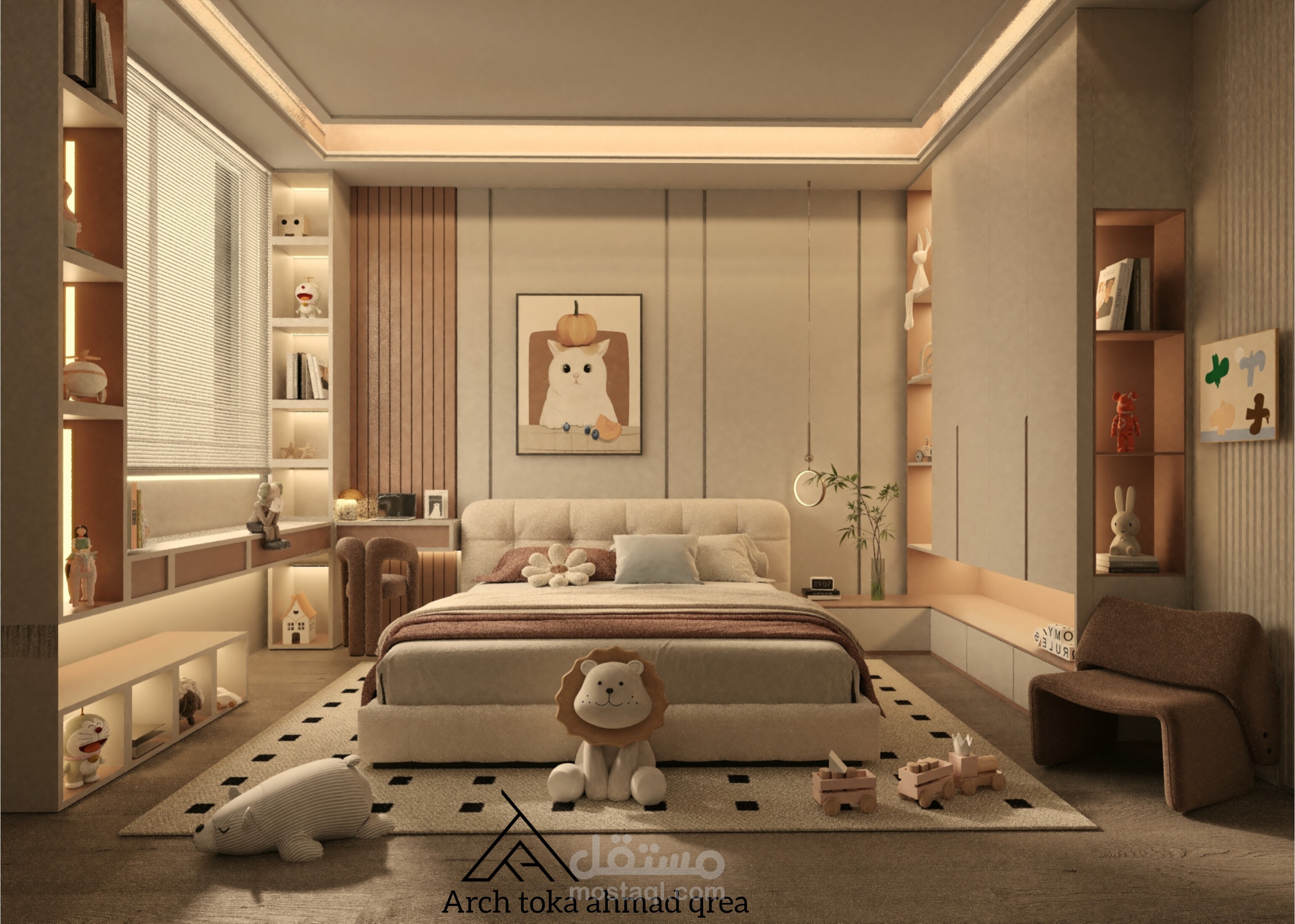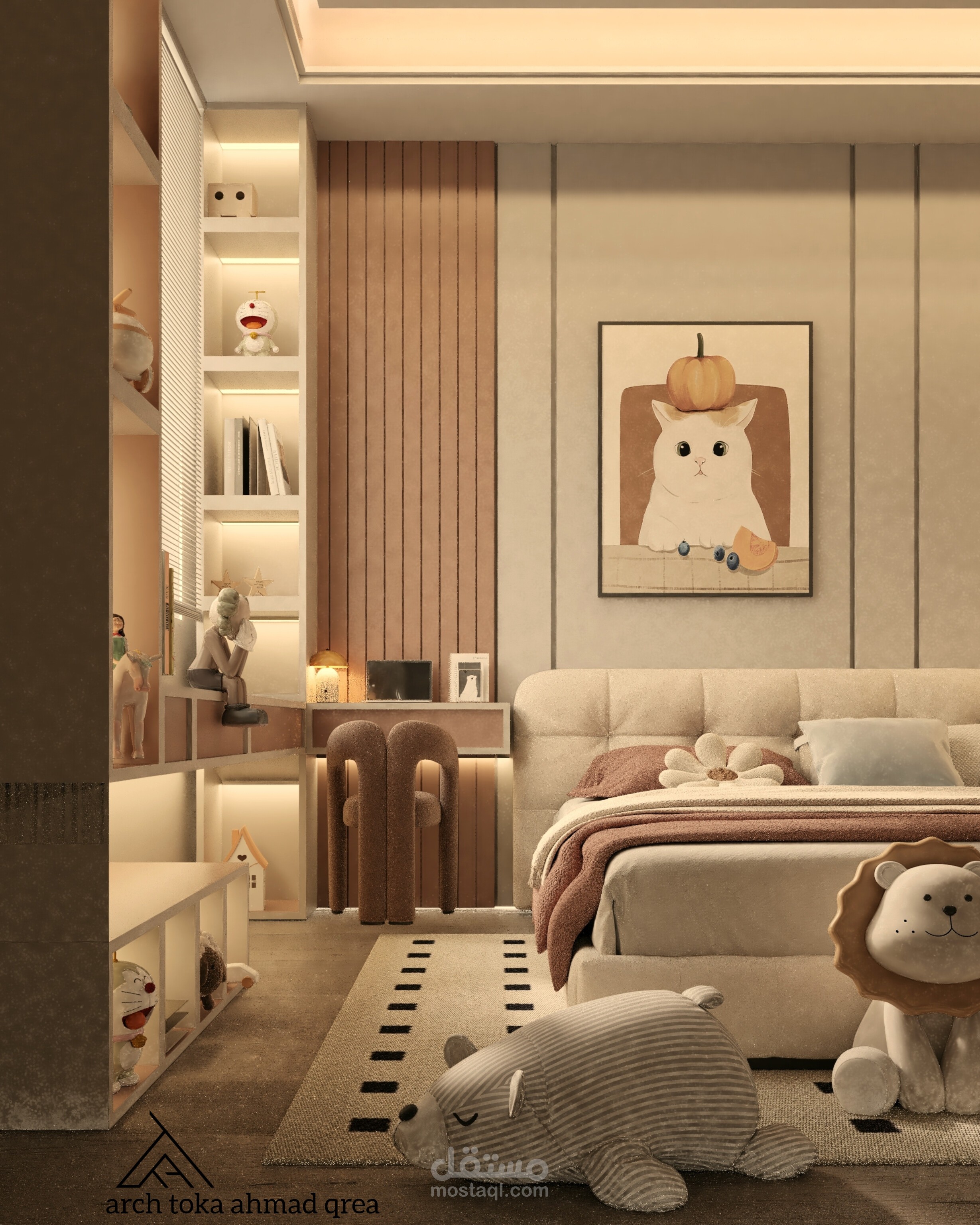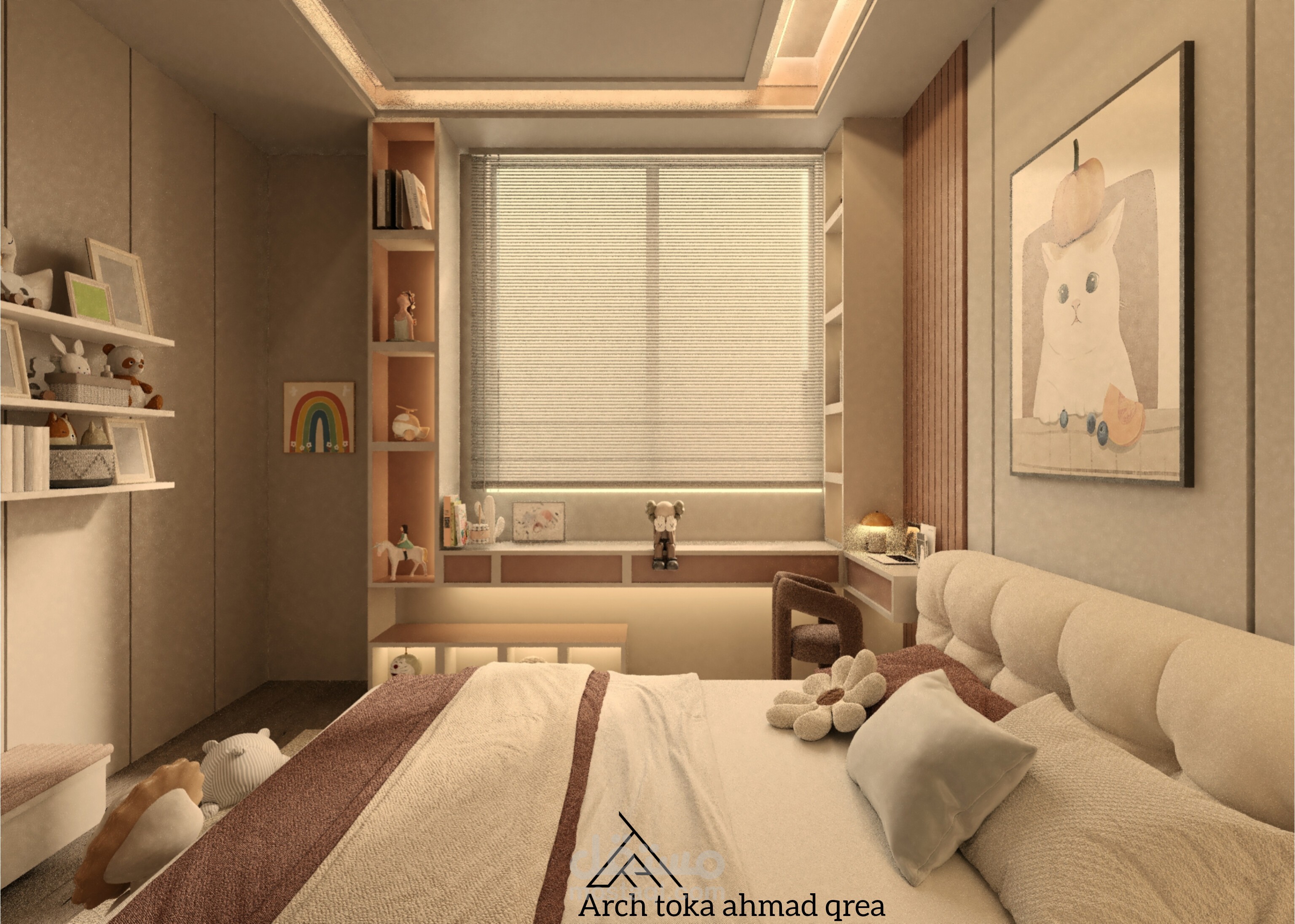 تصميم غرفة النوم مستوحى من عالم الخيال والألوان الزاهية، حيث تم دمج عناصر المرح والإبداع لتوفير بيئة مريحة وممتعة للطفلة. الغرفة مصممة لتكون متعددة الاستخدامات، تجمع بين منطقة النوم والدراسة واللعب.