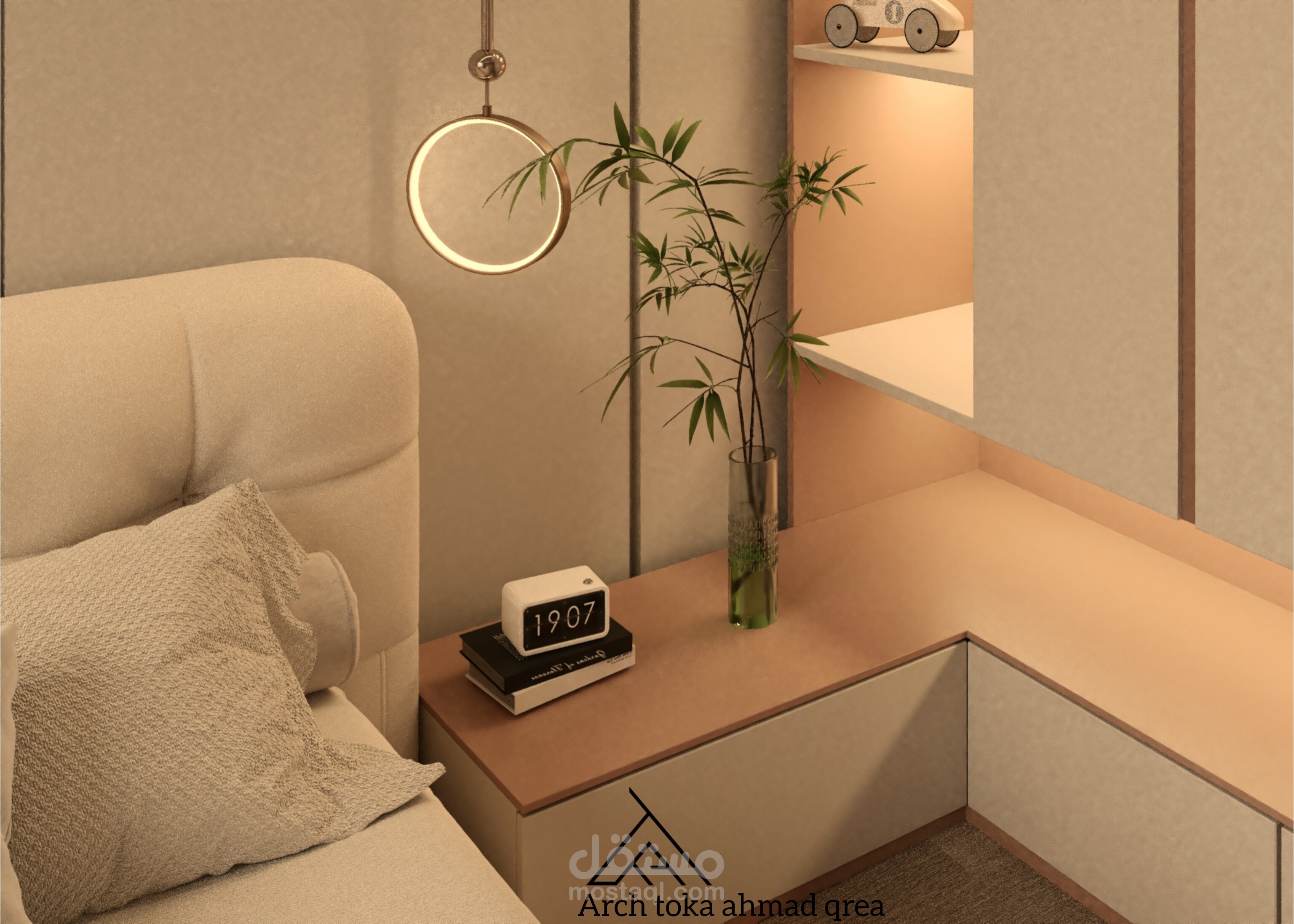 • استخدمت تقنية V-Ray لإضفاء الواقعية على الإضاءة والمواد، مما يجعل الغرفة تبدو حيوية وجذابة.