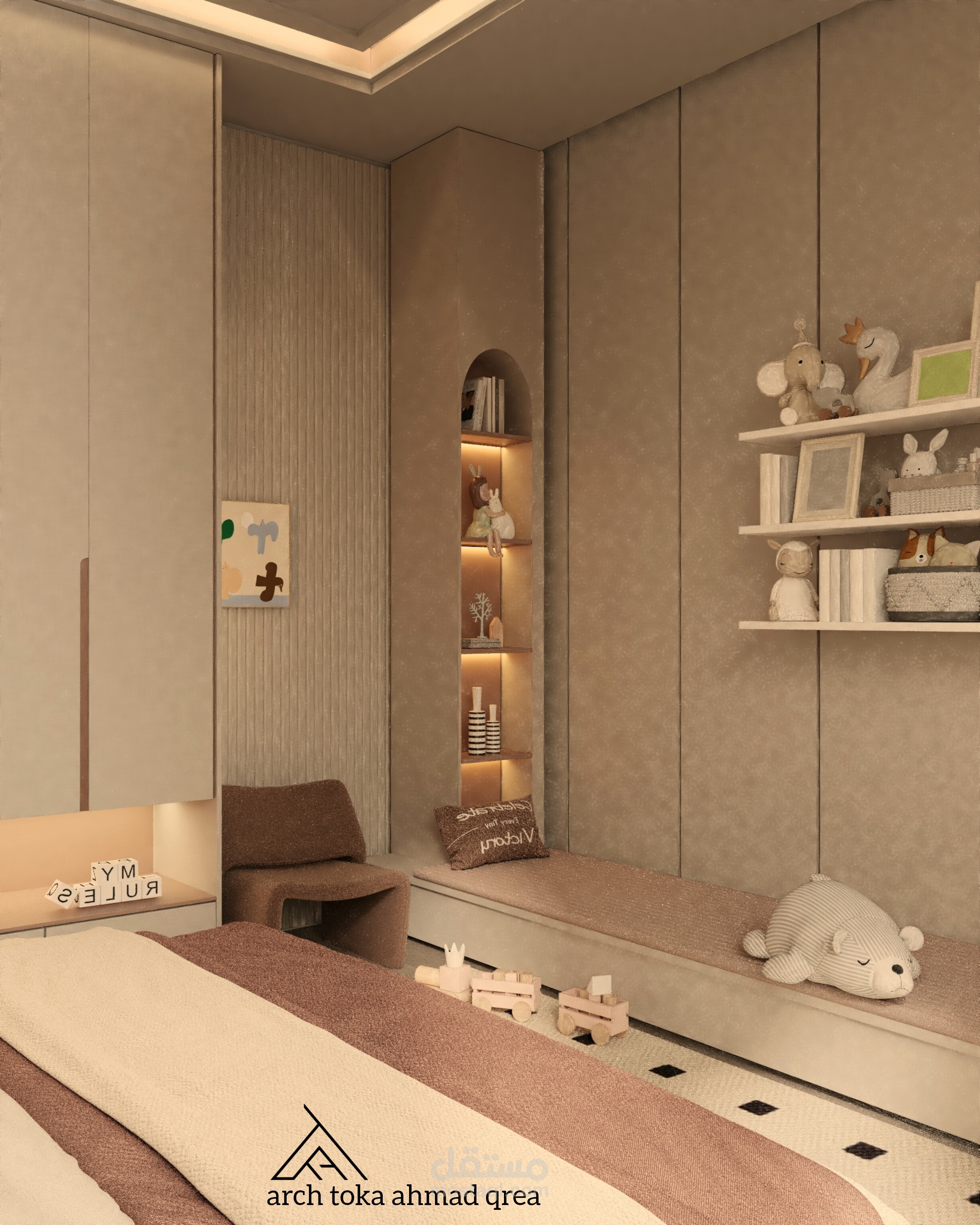 • منطقة اللعب: سجادة ناعمة بألوان زاهية، مع مجموعة من الألعاب والكتب.