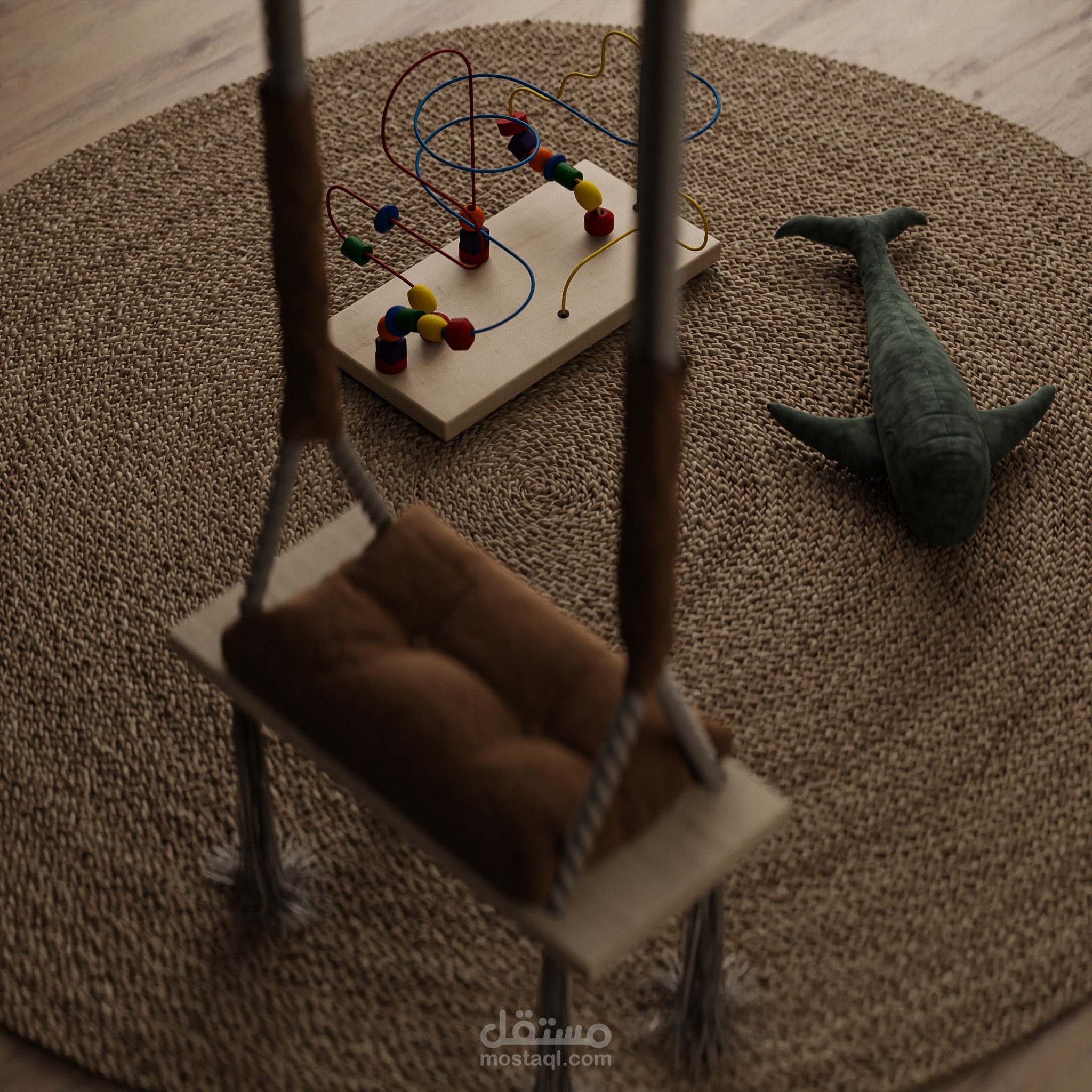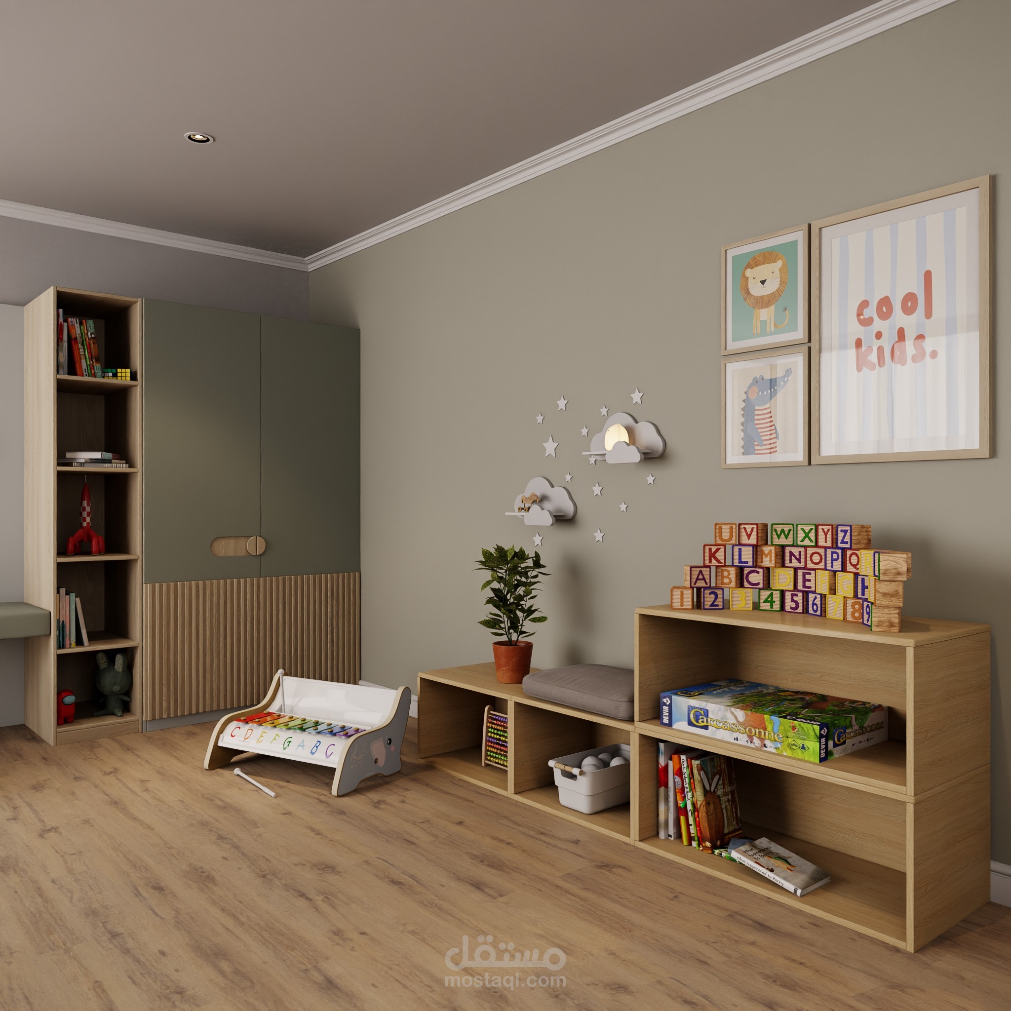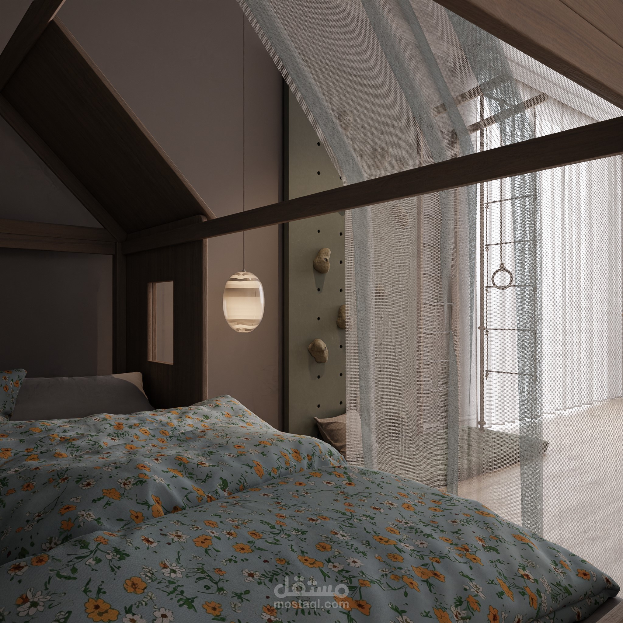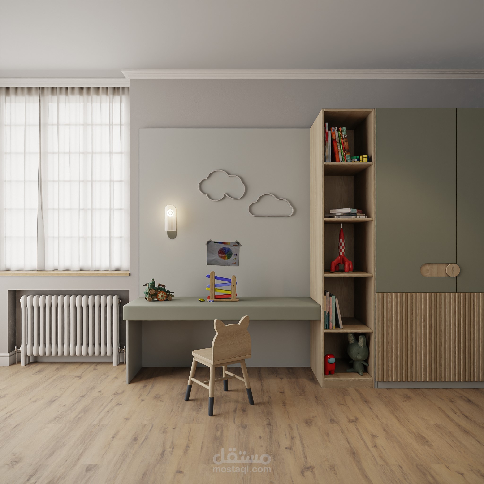 This project presents a children’s bedroom designed for a 5-year-old, using a natural color palette of green tones, beige, and wood. The space is filled with playful elements and activities that support movement, imagination, and daily exploration.