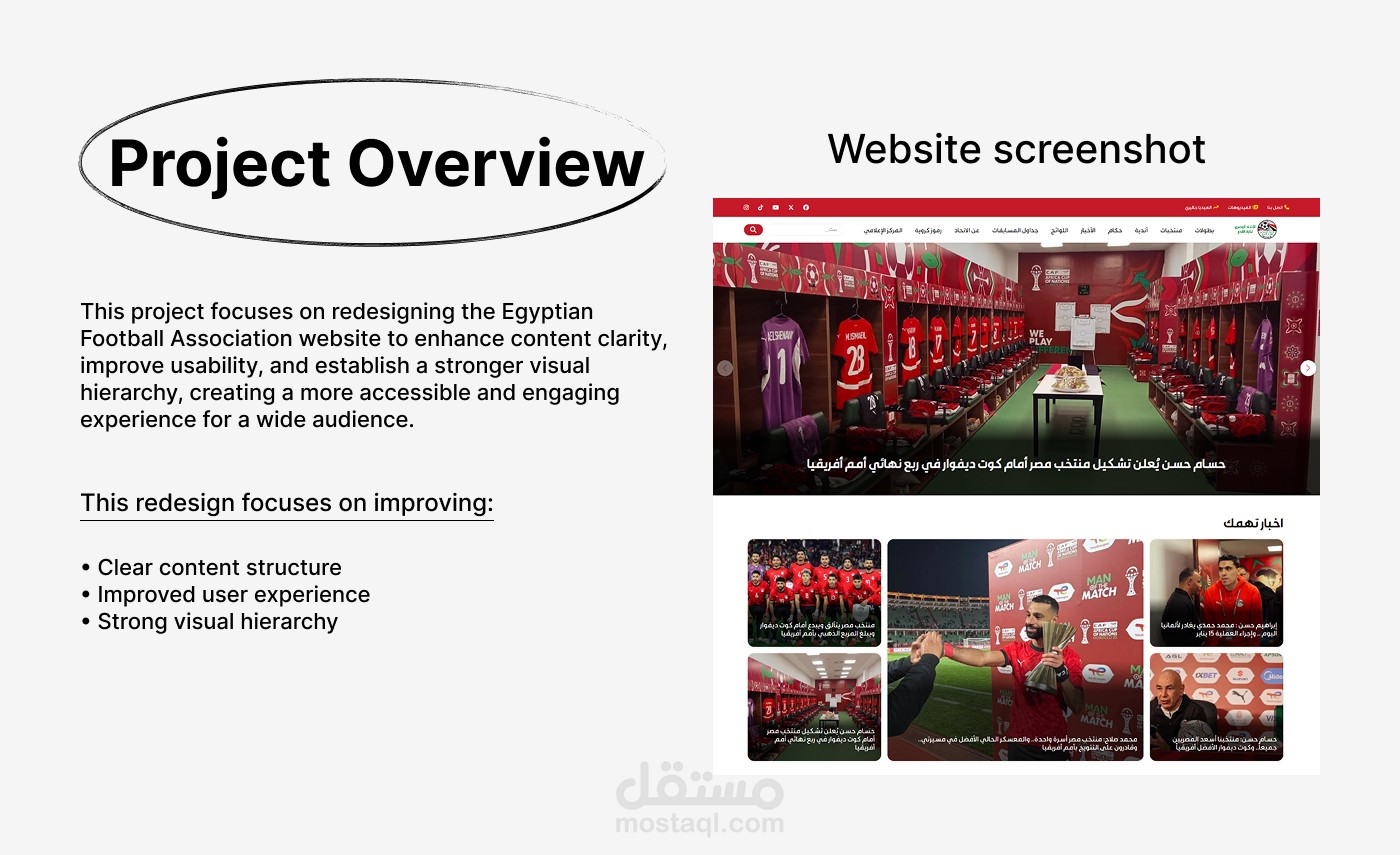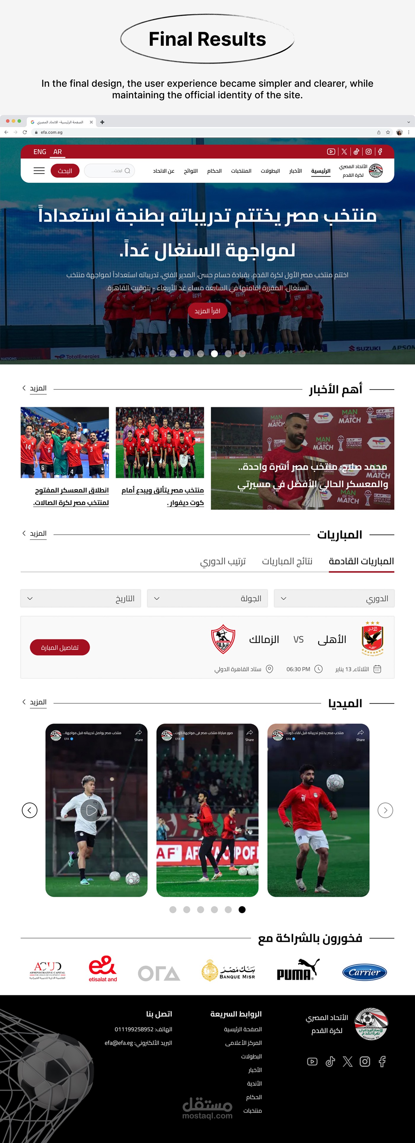 This project focuses on redesigning the Egyptian Football Association website to enhance content clarity, improve usability, and establish a stronger visual hierarchy, creating a more accessible and engaging experience for a wide audience.