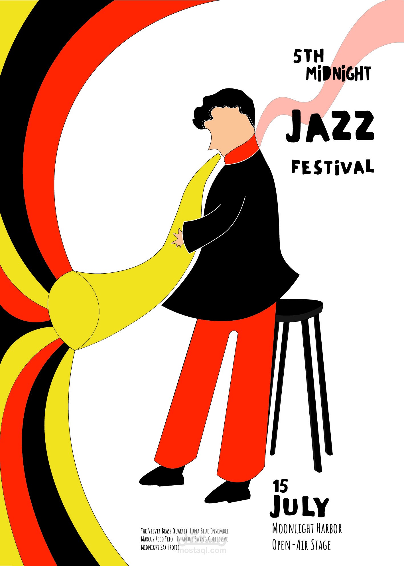 يجسّد هذا البوستر روح موسيقى الجاز في لحظة صفاء ليليّة هادئة، حيث يندمج العازف مع آلته في حالة انسجام كاملة بين النفس والصوت. لا يظهر الوجه بوضوح، في إشارة إلى أن البطل الحقيقي في المشهد هو الصوت والموسيقى وليس الشخص.