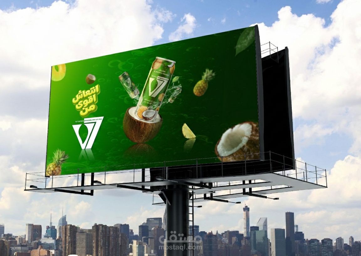 The Concept: A high-energy advertising visual for V7 Vitamin Sparkling Drink, focusing on the exotic Pinacolada flavor. The design aims to communicate freshness and natural energy.