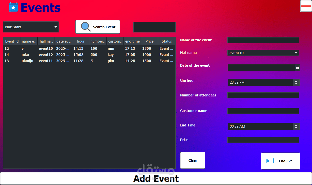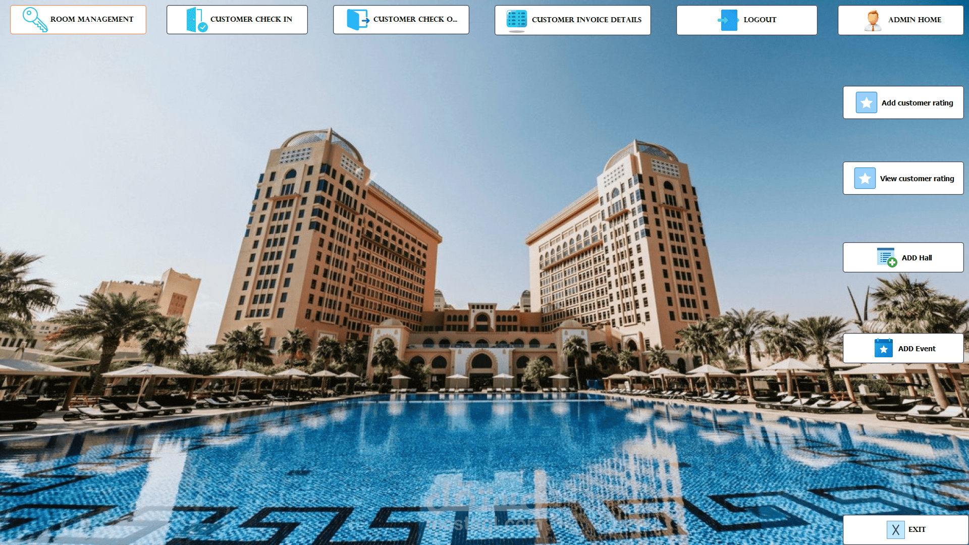 The project includes management of rooms, customers, invoices, events, halls, with backup + triggers + logs to save all operations.